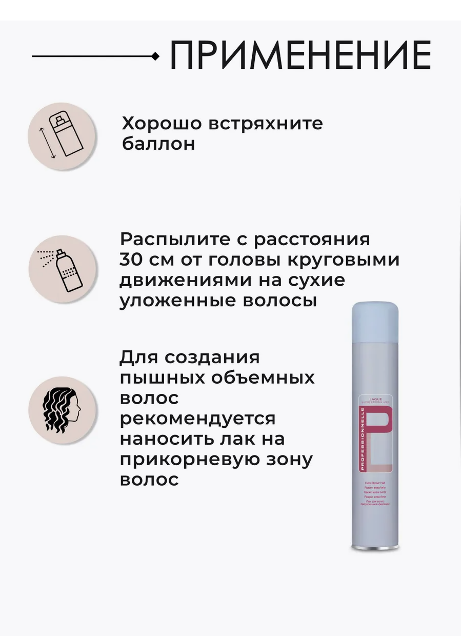 | Дополнительная информация | дизайн баллона лака Professionnelle изменился, теперь на нем будет отсутствовать логотип Schwarzkopf Professional, при этом логотип Professionnelle,формула и ингредиентный состав лака будут полностью соответствовать международной версии венгерского производства; быстро сохнет, не склеивая волосы; легко счесывается; придаёт естественный блеск |