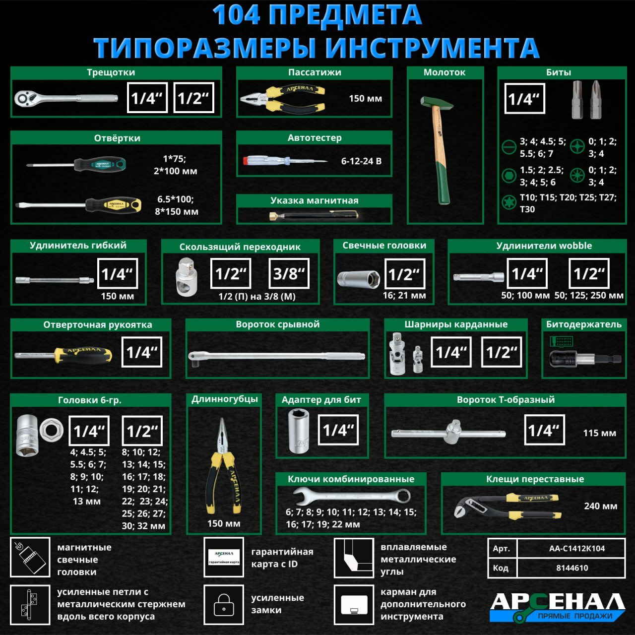 Набор инструмента 1/4" и 1/2", 104 предмета AUTO Арсенал АА-С1412К104, 8144610
