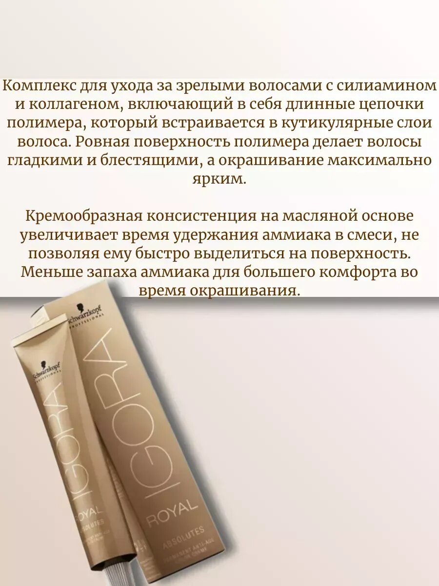 | Комплектация | Schwarzkopf Professional, Igora Royal, Absolutes Age Blend, 8-50 стойкая крем-краска для зрелых волос, Светлый русый золотистый натуральный, 60 мл |