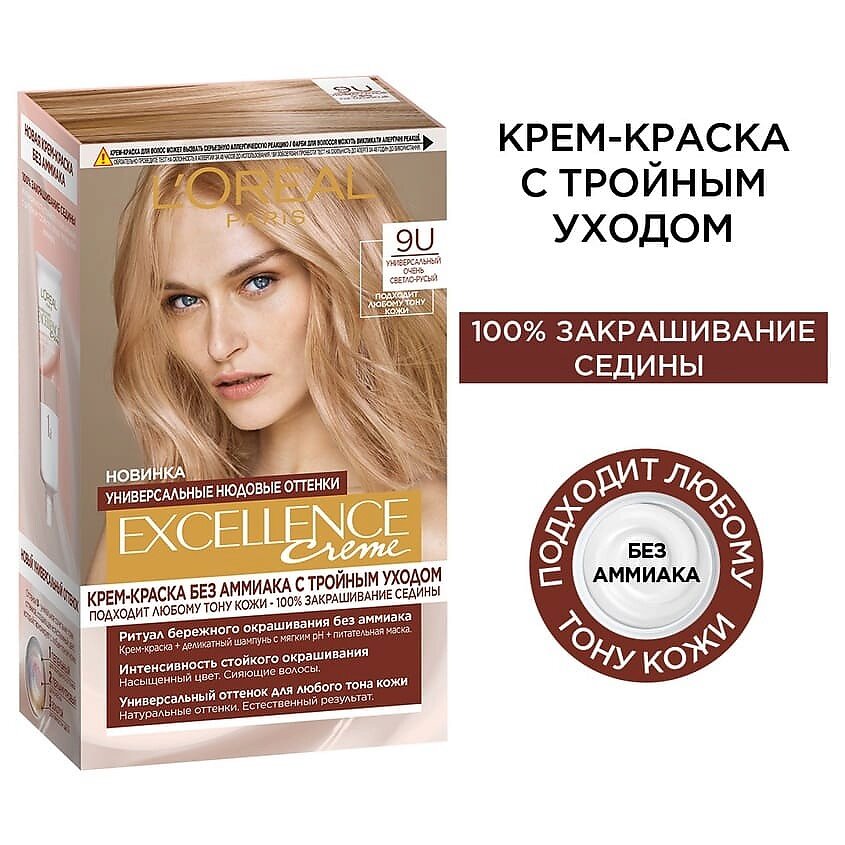 10 цен на L'Oreal Paris Крем-краска для волос Excellence Creme, 9U Очень светло-русый, без аммиака, Лореаль