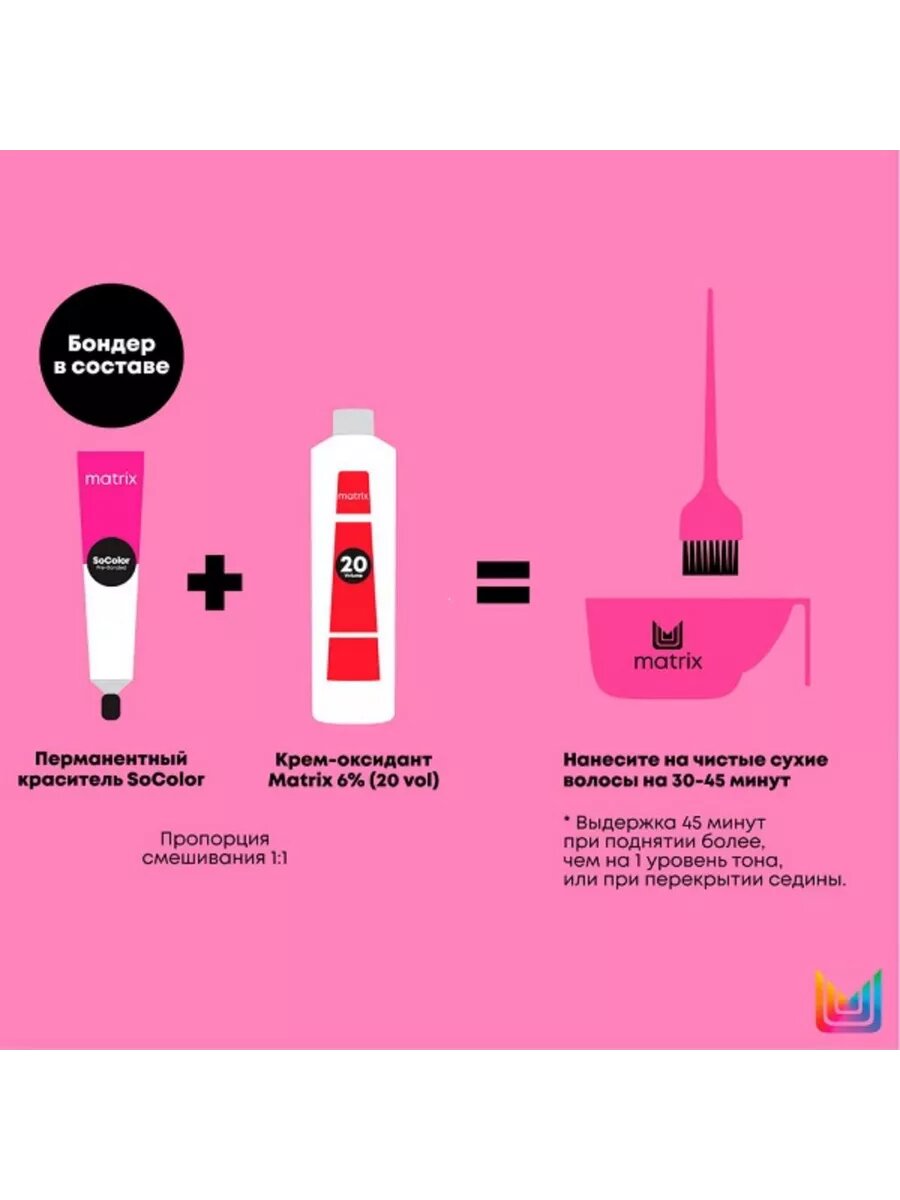 | Способ применения | Работайте в перчатках. Смешайте краситель с крем-оксидантом Matrix в пропорции 1 к 1 и нанесите смесь на волосы. Время выдержки зависит от базы и желаемого оттенка. Чтобы добиться стойкого и предсказуемого результата, производитель рекомендует использовать краситель только с оксидантами Matrix. |