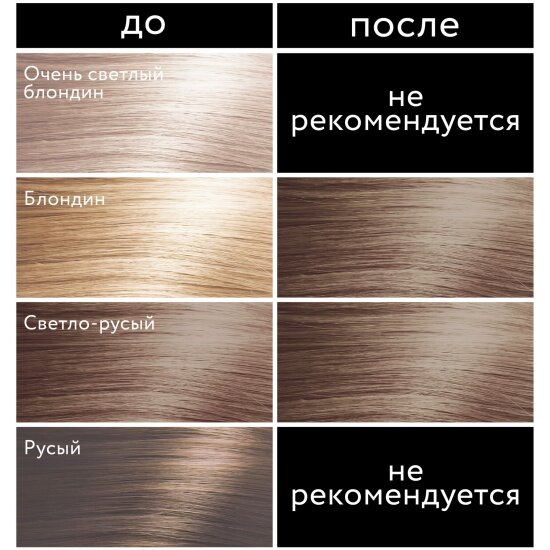 | Дополнительная информация | краситель – 50 мл, окислитель – 50 мл, бальзам – 15 мл Перед применением проведите тест на аллергическую реакцию. Не обязательно мыть волосы перед окрашиванием. Рекомендуется выдержать 2 недели до и после химической завивки. Не рекомендуется использовать краску на волосах, окрашенных хной. |