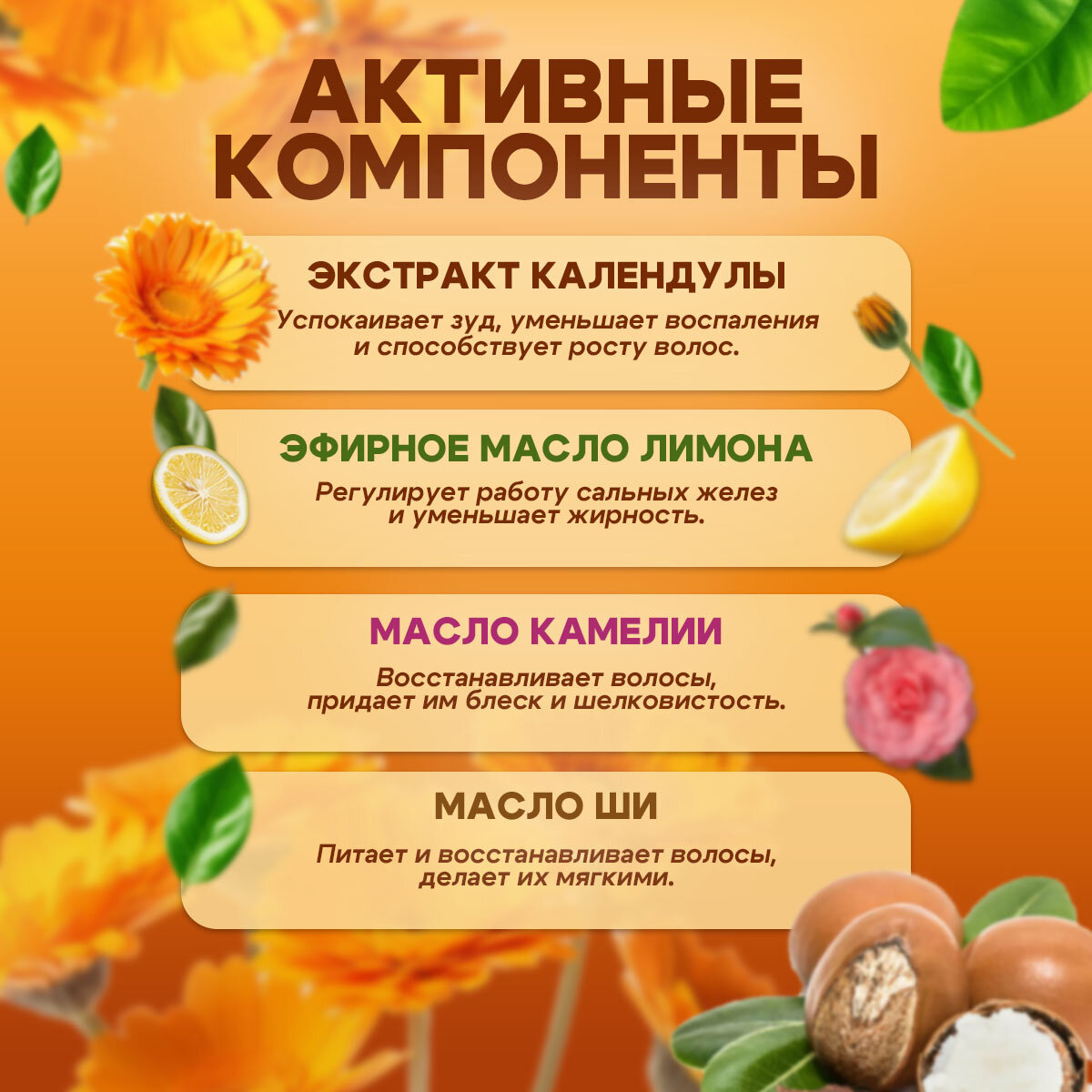 | Масла и экстракты | кокосовое масло / масло бразильского ореха / масло виноградных косточек / масло какао / масло камелии / масло лимона / масло розмарина / масло чайного дерева / масло ши (карите) / оливковое масло / экстракт виноградных косточек / экстракт жасмина / экстракт календулы / экстракт корицы / экстракт лимона / экстракт морских водорослей / экстракт розмарина / экстракт розы |