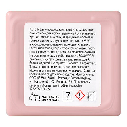 | Дополнительная информация | хранить в сухом, прохладном месте вдали от прямых солнечных лучей, рекомендуемая температура от 10 до 26 С. В открытом состоянии избегать попадания на гель—лак и кисть лучей ультрафиолетовой/LED лампы. Перед каждым использованием рекомендуется немного «разогреть» флакон в ладонях для равномерного распределения пигмента |