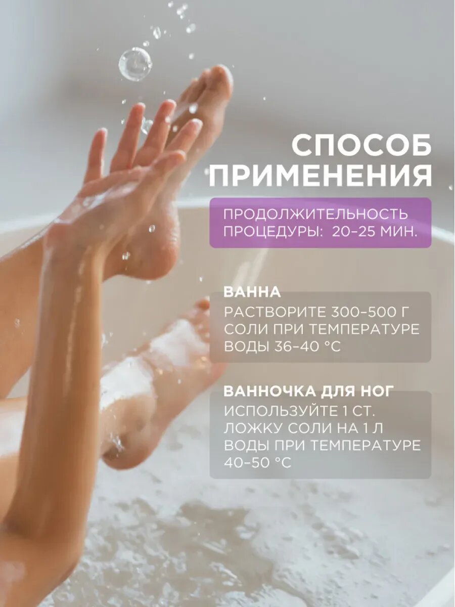 | Способ применения | для ванны - растворить 300-500 грамм соли во всем объеме ванны при температуре воды 36-40 градусов. Для ванночки для ног - растворить соль из расчета 1 ст. л. на литр воды при температуре 40-50 градусов. Продолжительность процедуры — 10-15 минут |