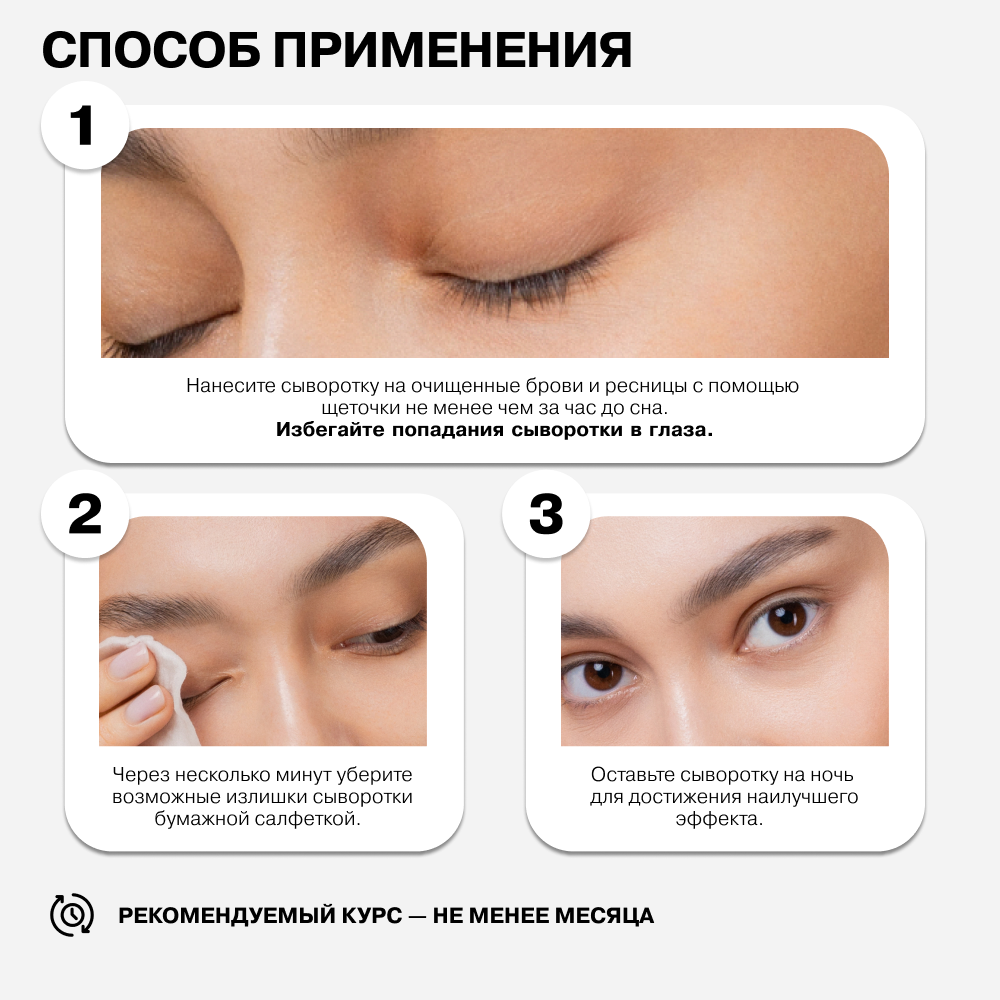 | Способ применения | нанести на очищенные брови и ресницы с помощью щеточки, не наносить на кожу! через несколько минут уберите возможные излишки сыворотки бумажной салфеткой, оставьте сыворотку на ночь для достижения наилучшего эффекта |
