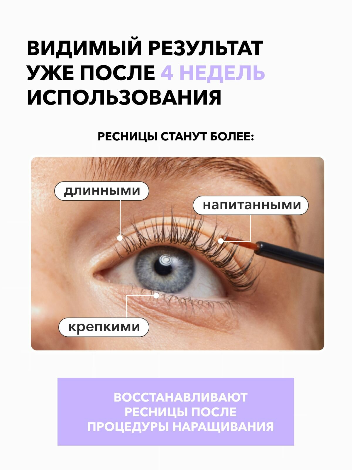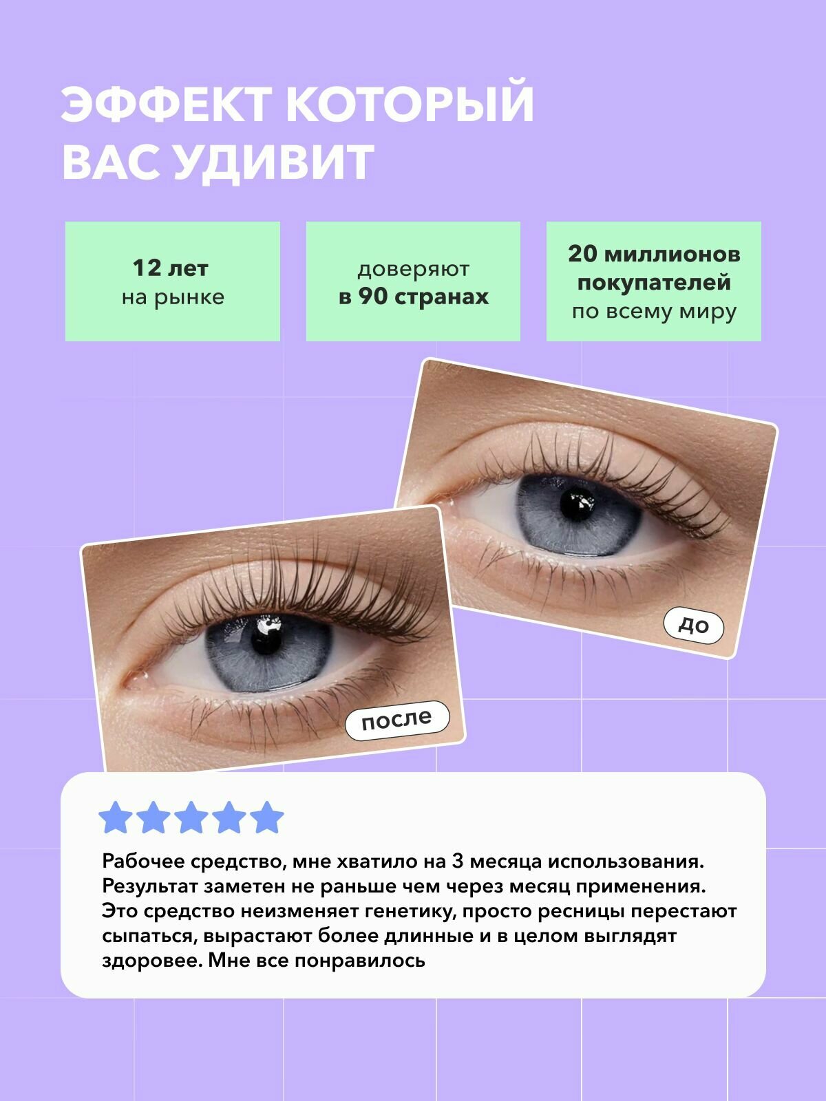 | Дополнительная информация | Без гормонов, протестировано офтальмологами и дерматологами, гарантия роста ресниц, научная разработка. Активные ингредиенты: биодоступный пептид, гиалуроновая кислота, биотин, витамин B8 |