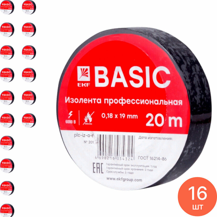 Изолента ПВХ EKF / ЕКФ Basic профессиональная 0.18х19мм, черная 20м, plc-iz-a-b / защитная лента (комплект из 16 шт) информация: