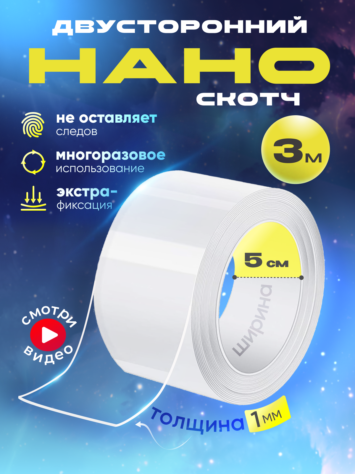 Двусторонний нано скотч прозрачный клейкая лента длина 3 метра ширина 5 см информация:
