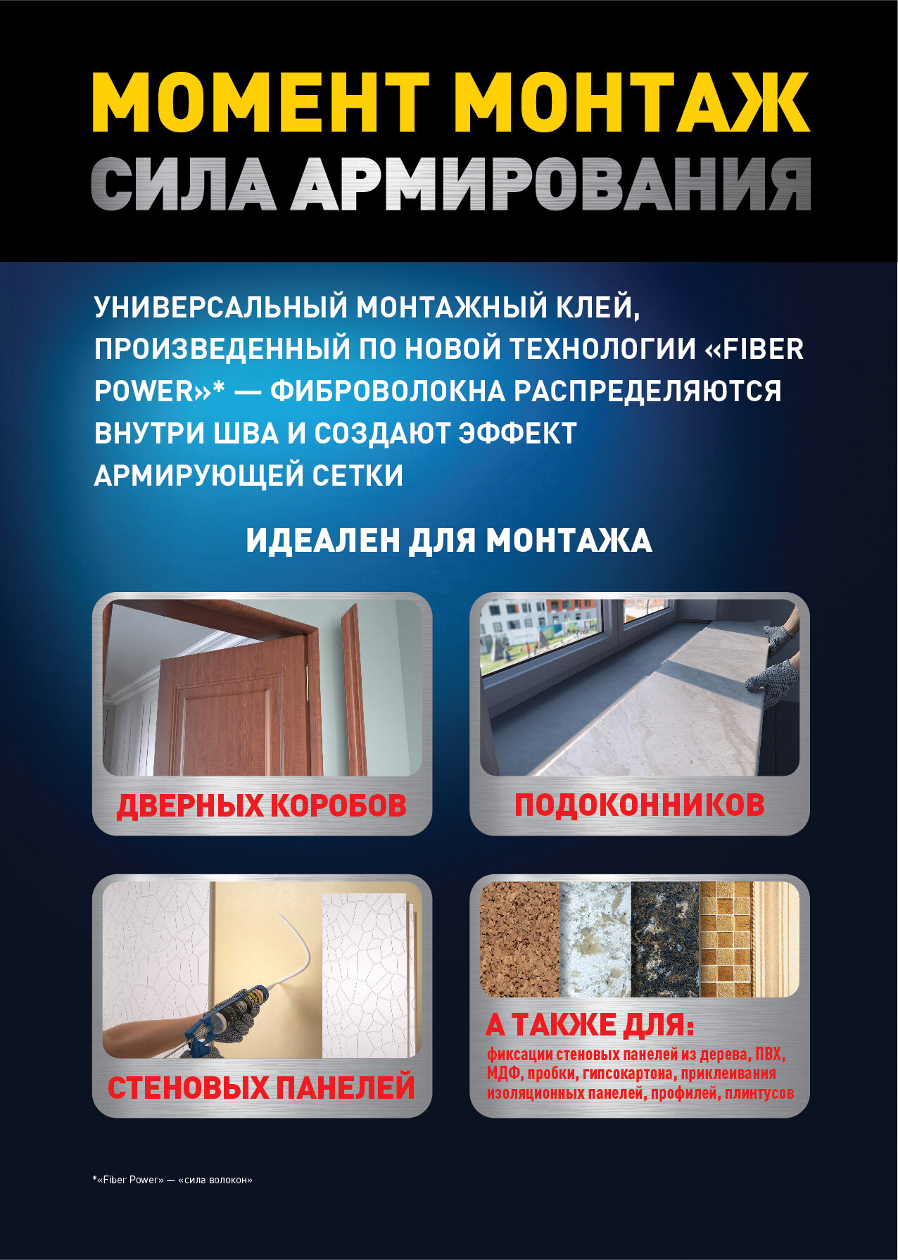 | Дополнительная информация | Клей монтажный Момент Монтаж Сила Армирования белый (400гр) |