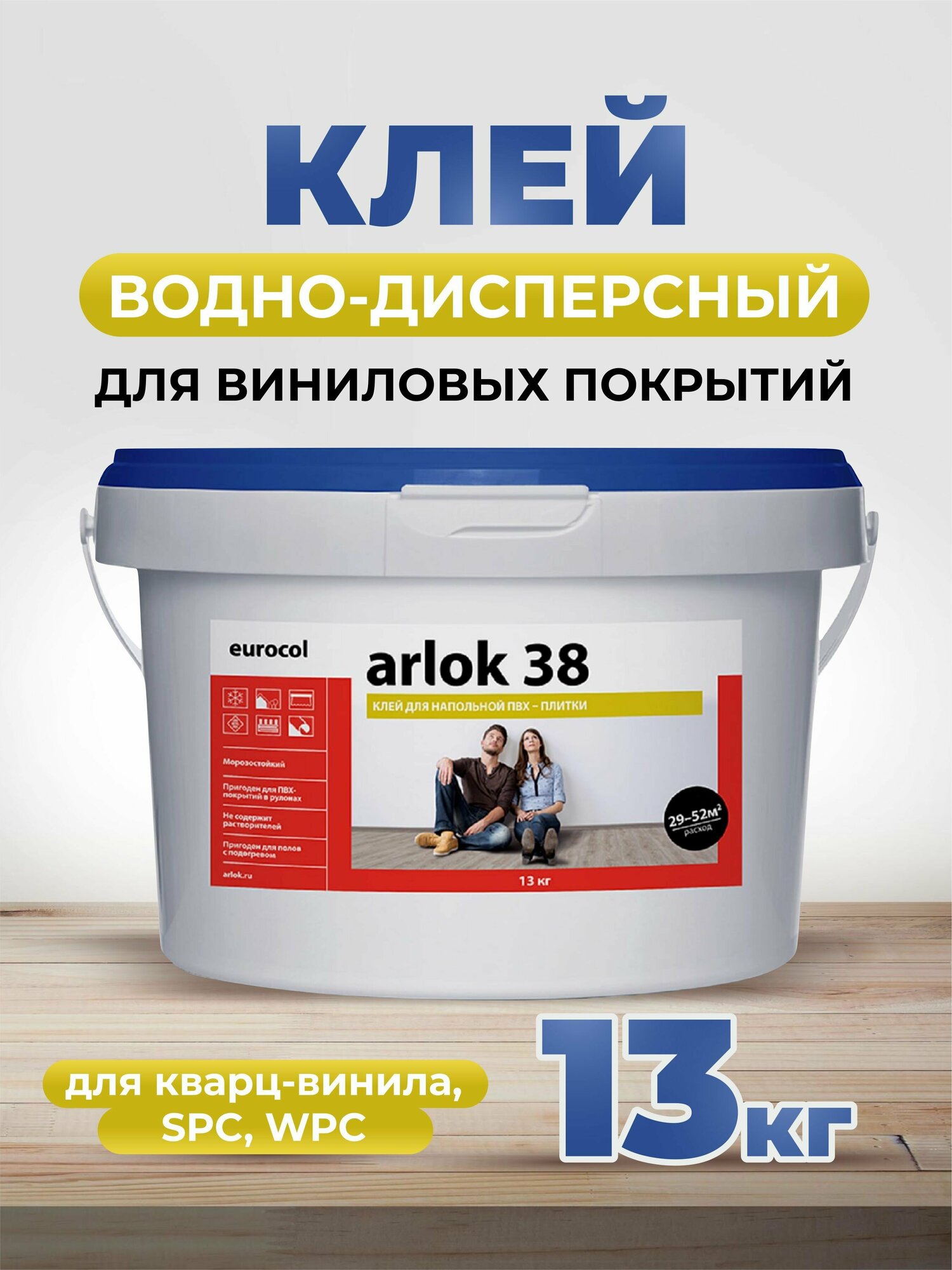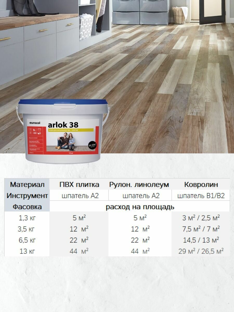 Клей Arlok 38 для кварцвинила, линолеума, ПВХ, LVT, SPC 6.5 кг / Клей водно-дисперсионный для виниловых, LVT SPC, ПВХ покрытий Eurocol Arlok 38 банка 6.5 кг 4 950 ₽