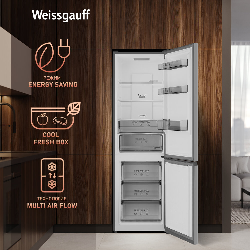 Отдельностоящий холодильник с инвертором Weissgauff WRK 2000 Total NoFrost Inverter Inox двухкамерный шириной 60 см, 3 года гарантии, Тихий режим 40 дБ, Полезный объём 342л, Электронное управление, Супер заморозка 15кг сутки, Зона свежести, А++ 65 910 ₽