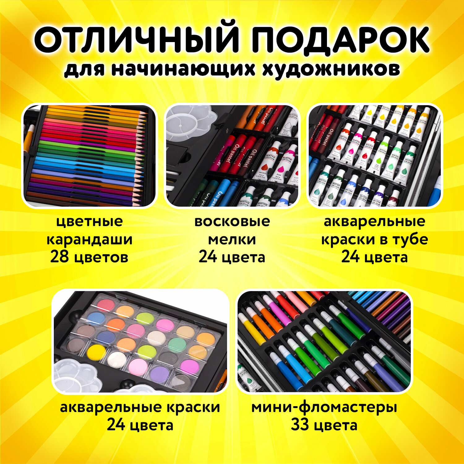| Состав набора | альбом / карандаши / кисточка / краска / ластик / мольберт / палитра / пастель / точилка / фломастеры |