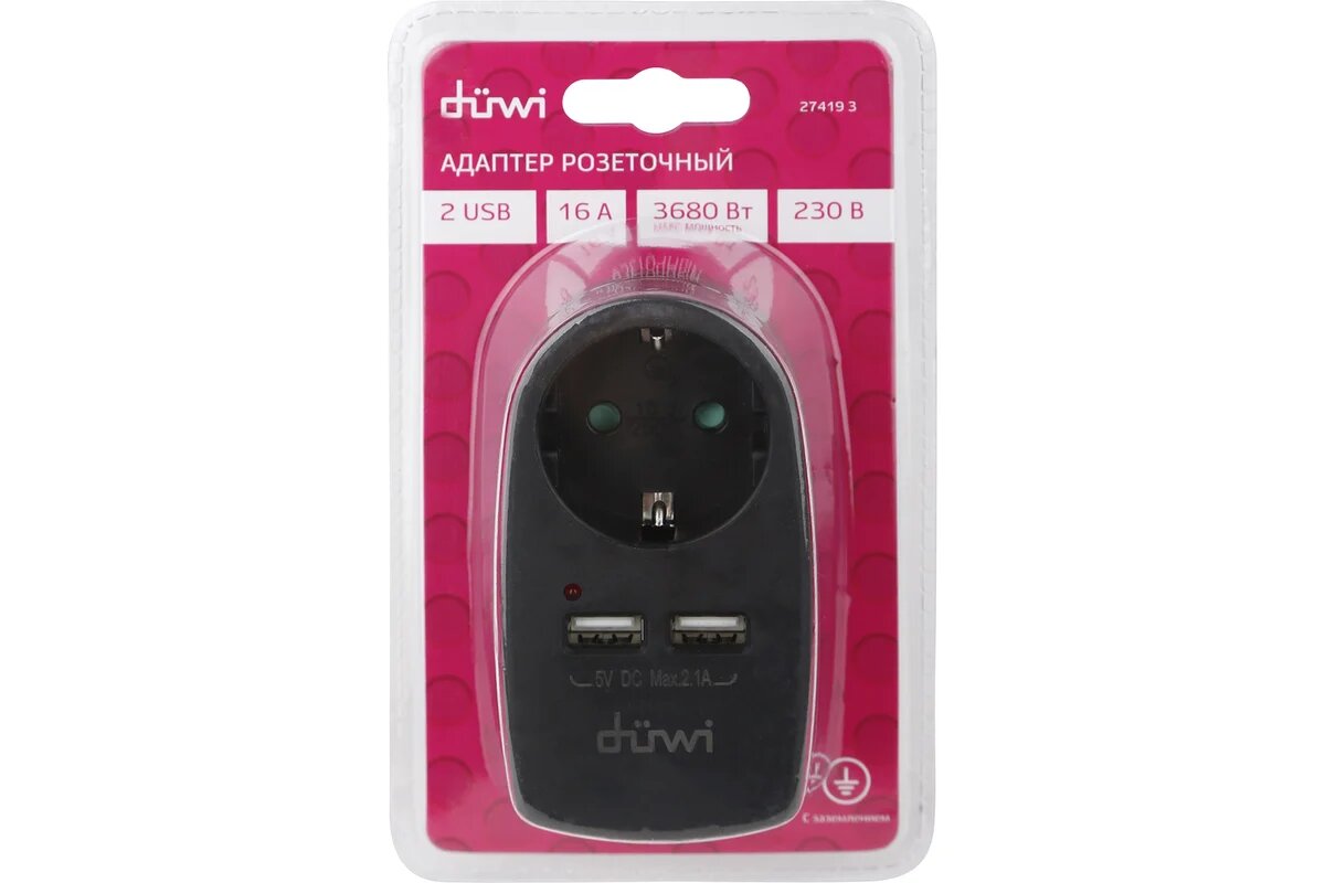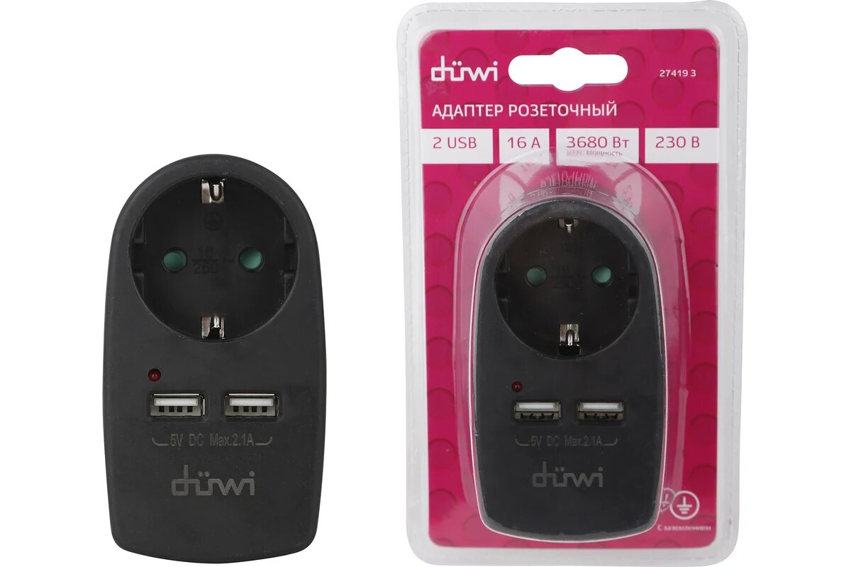 Отзывы на Розеточный адаптер duwi 1 гнездо + 2 USB порта с заземлением черный 16A 3680Вт 27419 3