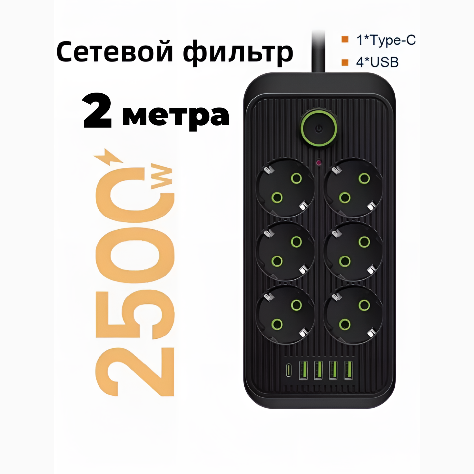 Удлинитель сетевой фильтр с USB зарядкой, 6 розеток 4 USB +1 Type 2 метра 850 ₽