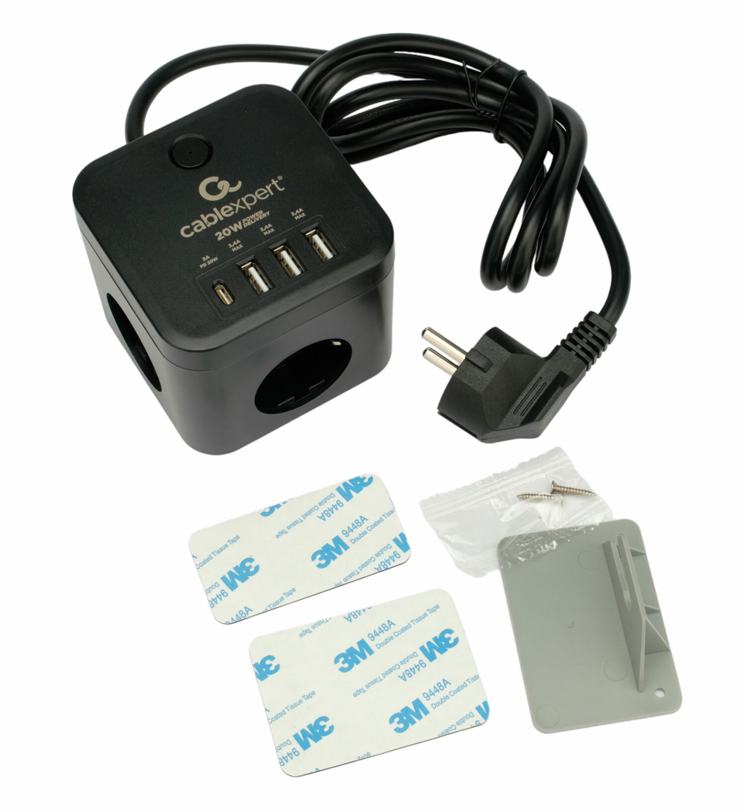 Сетевой фильтр Cablexpert Cube, 3 розетки, 1xType-C, 3xUSB, 1.5м, черный, коробка информация:
