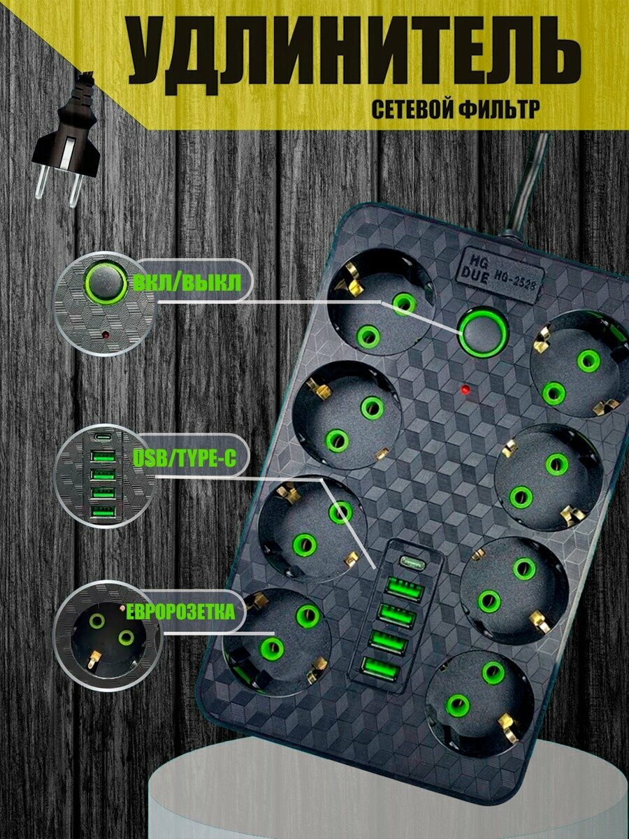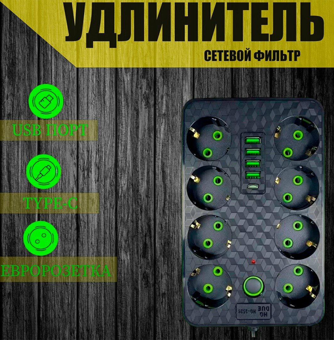 Сетевой фильтр с 6 розетками 2USB + 1 Type-C / Многофункциональный удлинитель с предохранителем 780 ₽