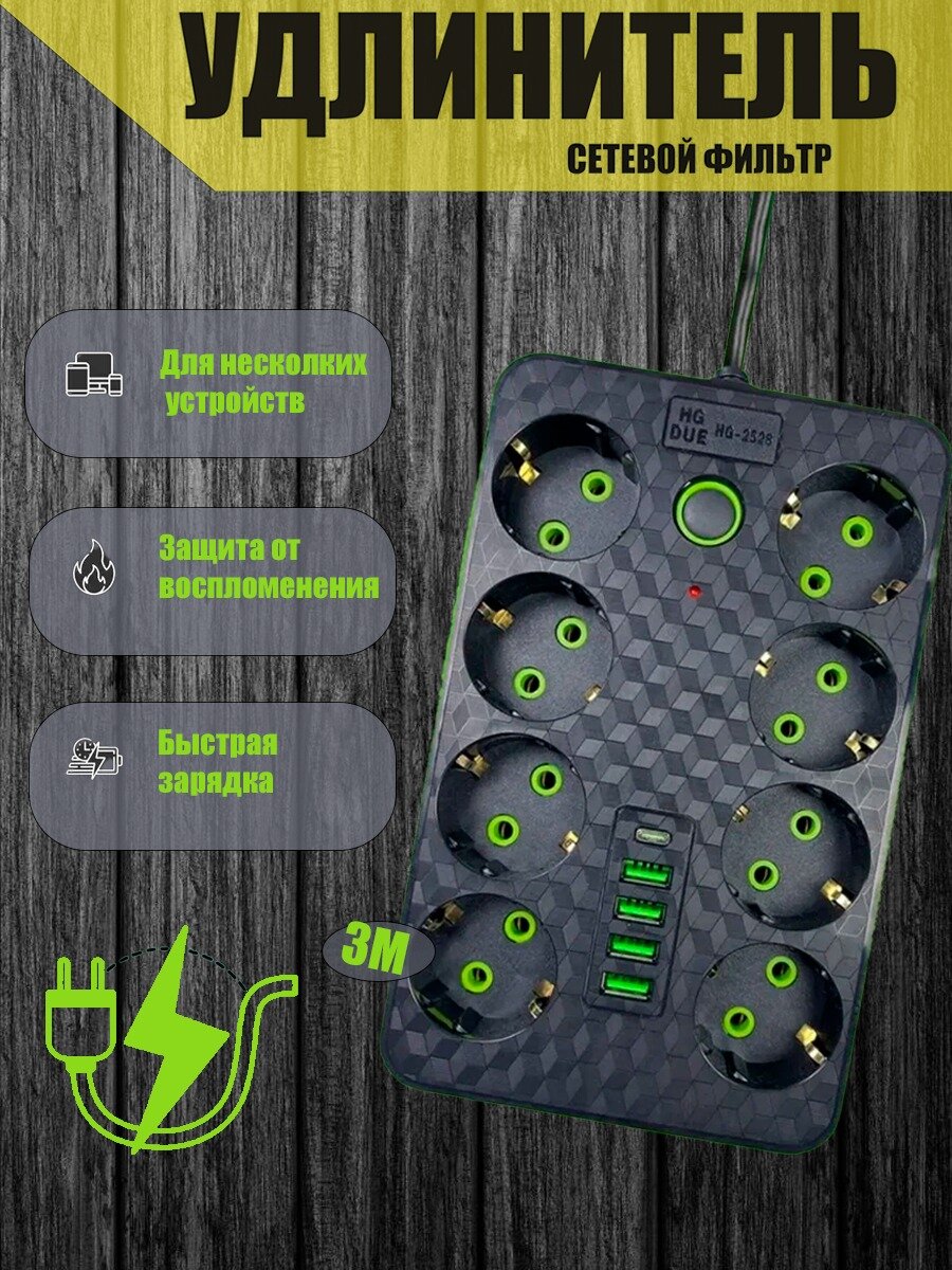 Сетевой фильтр SUPERNOWA с 6 розетками 2USB + 1 Type-C / Многофункциональный удлинитель с предохранителем
