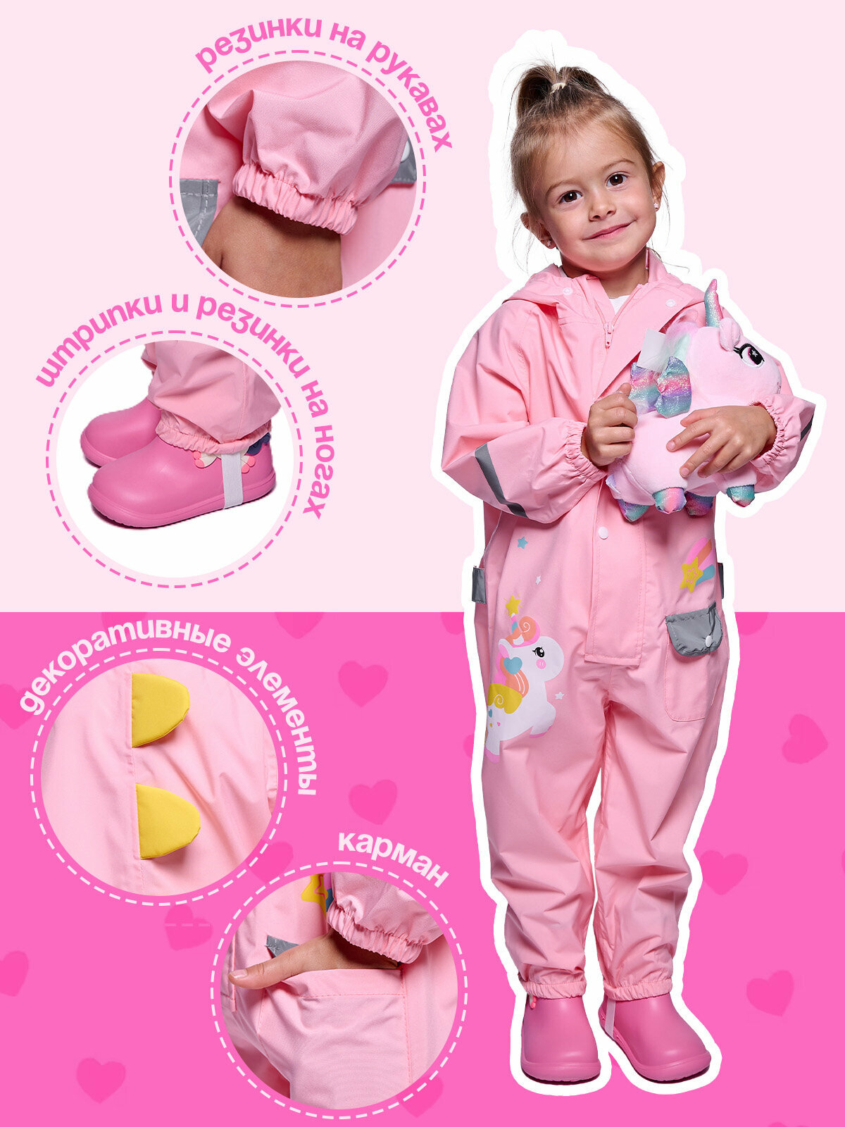 Яркий розовый комбинезон-дождевик для детей "Единорог" от бренда Cozy&Dozy, размер M 2 300 ₽