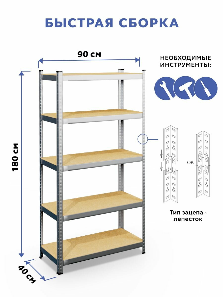 Стеллаж металлический безболтовой GASTRORAG GR-003-3, 5 полок МДФ, размеры 180х90х40 см, этажерка для кухни, мебель лофт, система хранения для дома, дачи и гаража 4 923 ₽