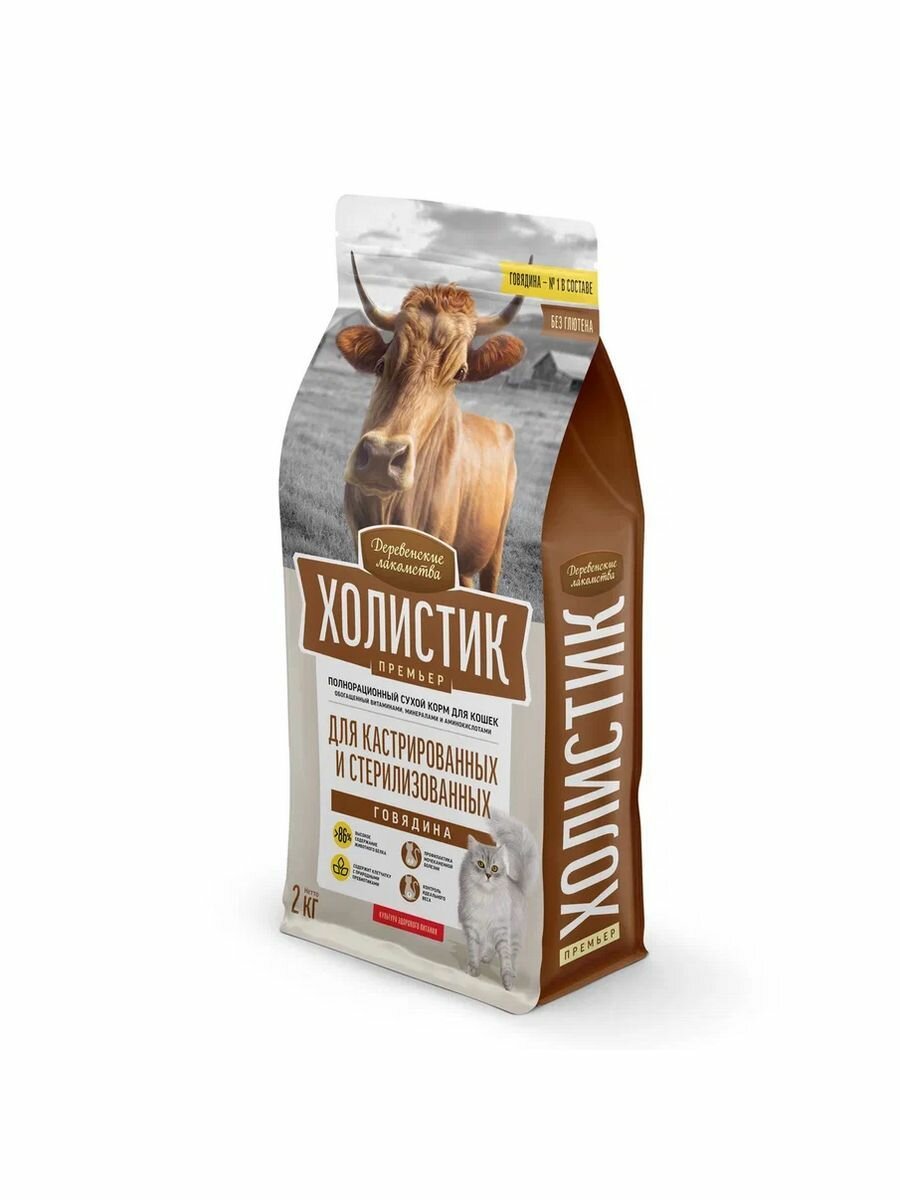 Корм сухой Деревенские Лакомства холистик премьер полнорационный, для стерилизованных кошек с говядиной, 2 кг