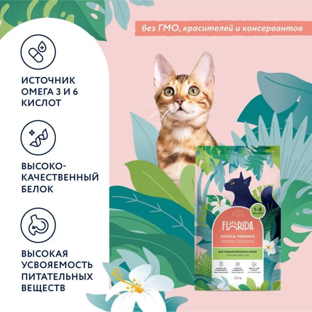 FLORIDA для взрослых кошек кастрированных котов и стерилизованных кошек с лососем и черникой (0,8 кг)
