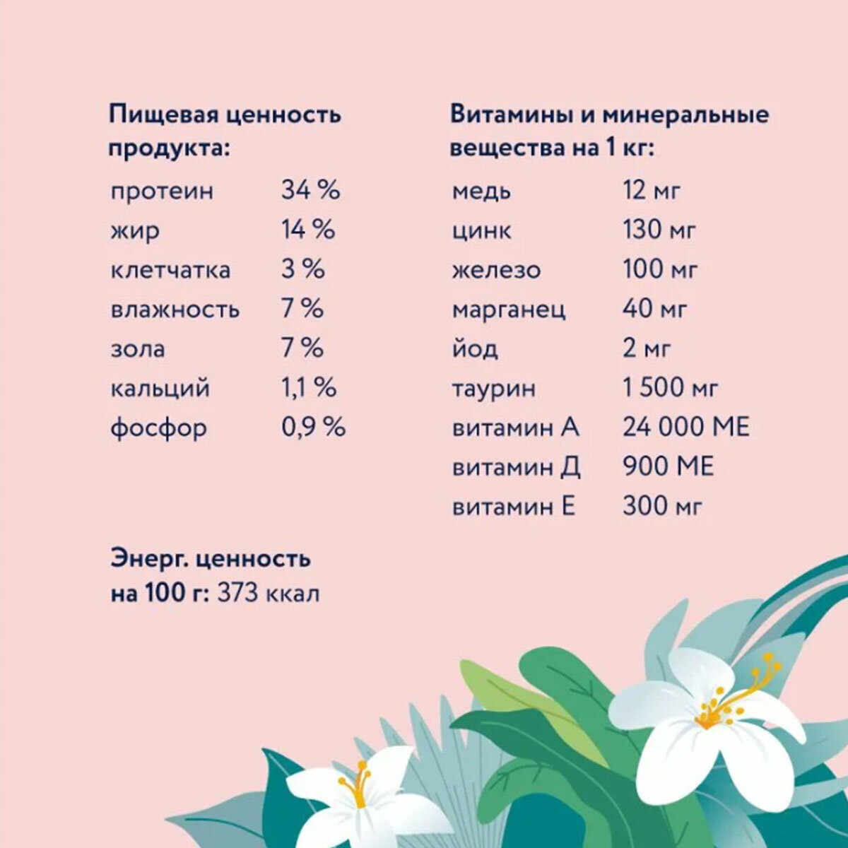 | Минеральные вещества | Медь 12 мг/кг, Цинк 130 мг/кг, Железо 100 мг/кг, Марганец 40 мг/кг, Йод 2 мг/кг, таурин, 1500 мг/кг |