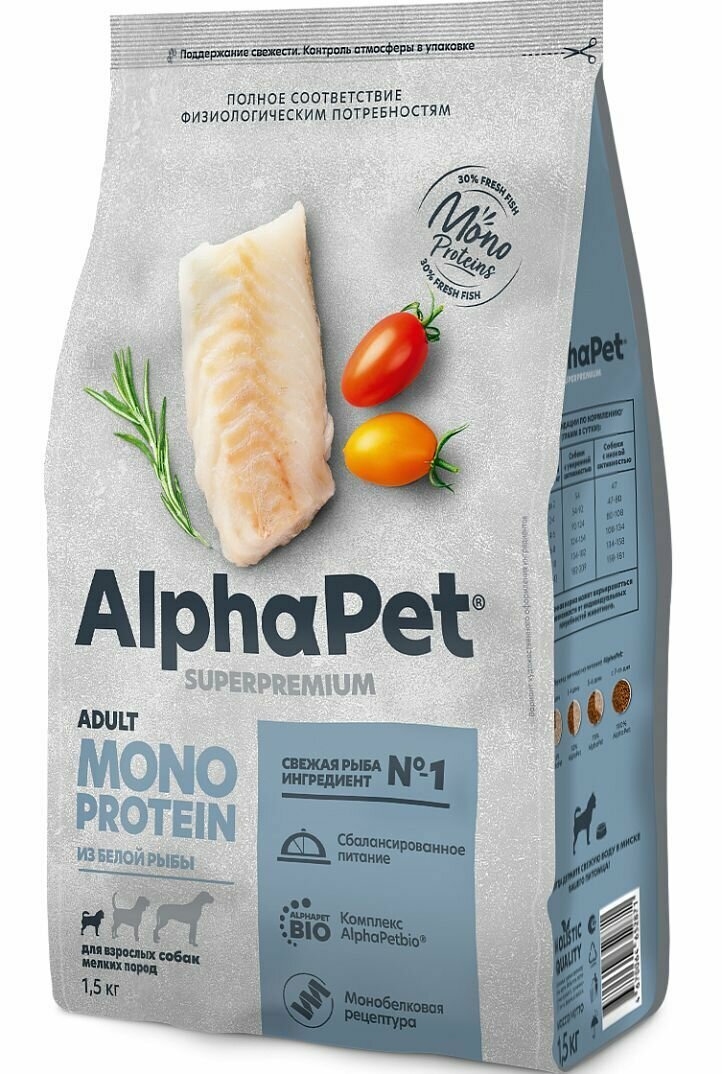 Корм сухой Alpha Pet АльфаПет MONOPROTEIN, Белая рыба для взрослых собак мелких пород, 1,5 кг информация: