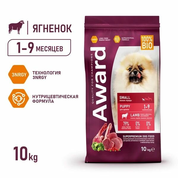 10 цен на Сухой корм 10 кг с индейкой и ягненком AWARD для щенков от 1 месяца, беременных и кормящих сук мелких и пород, 1 упаковка