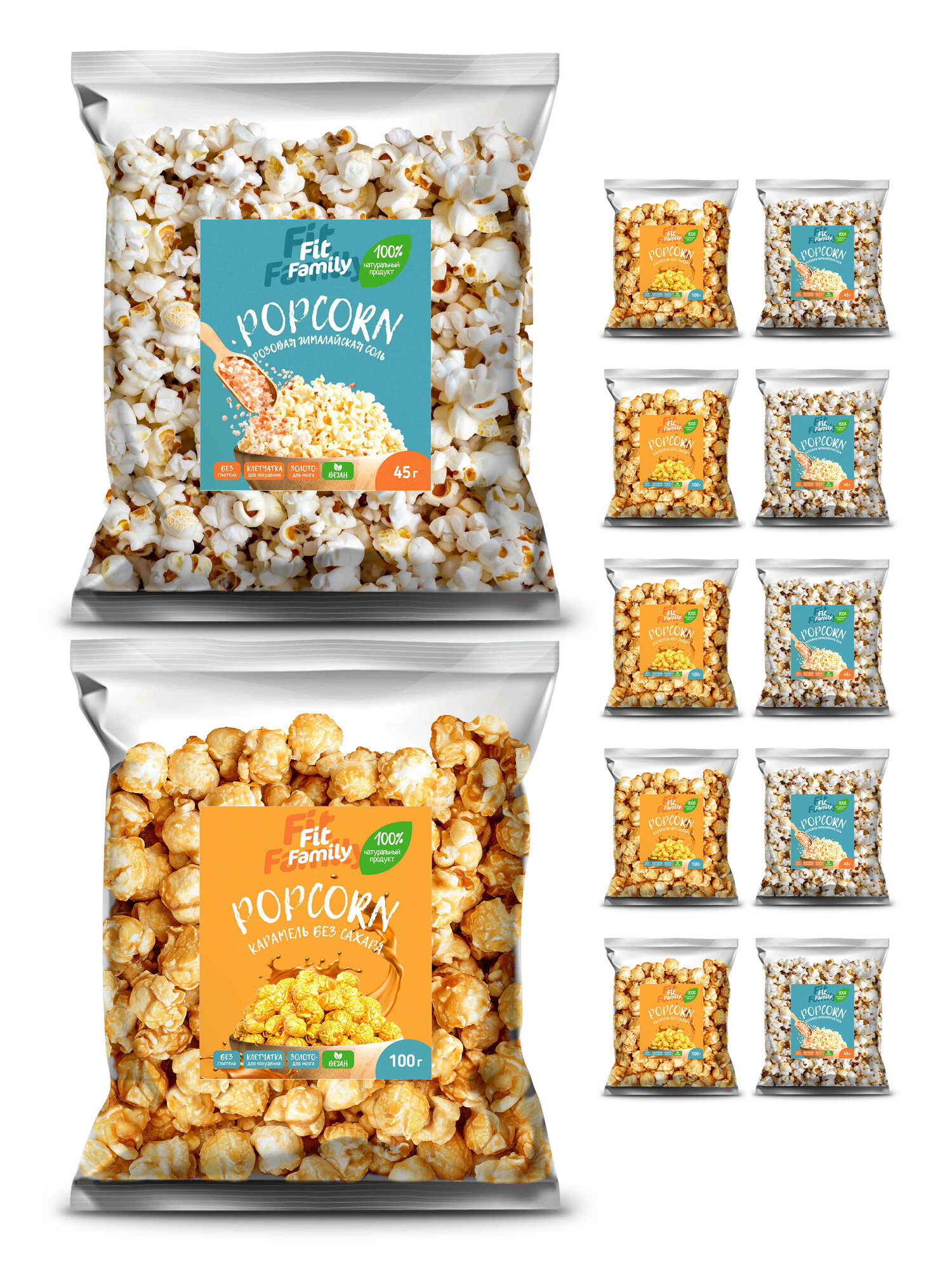 Попкорн готовый FIT Family в карамели без сахара с пребиотиком 5 шт. по 100 г + соленый с гималайской солью, 5 шт. по 45 г информация: