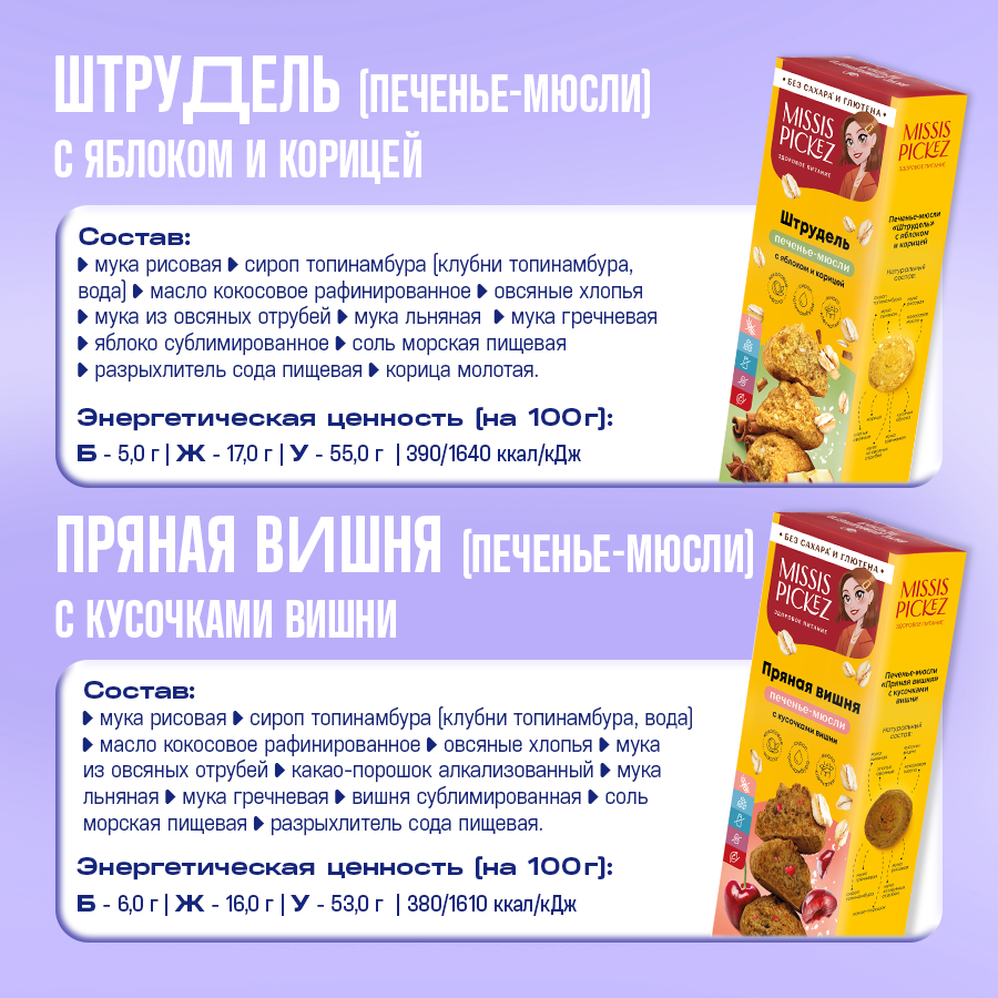 Missis Pickez Печенье Пряная вишня, Штрудель, Апельсиновое, Банановое Без лактозы глютена и сахара Набор - 4 пачки информация: