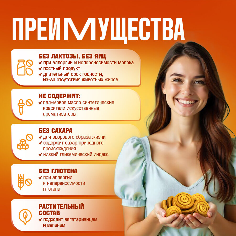 | Не содержит | ГМО / глютен / консерванты / красители / лактозу / пальмовое масло / сахар / яйца |