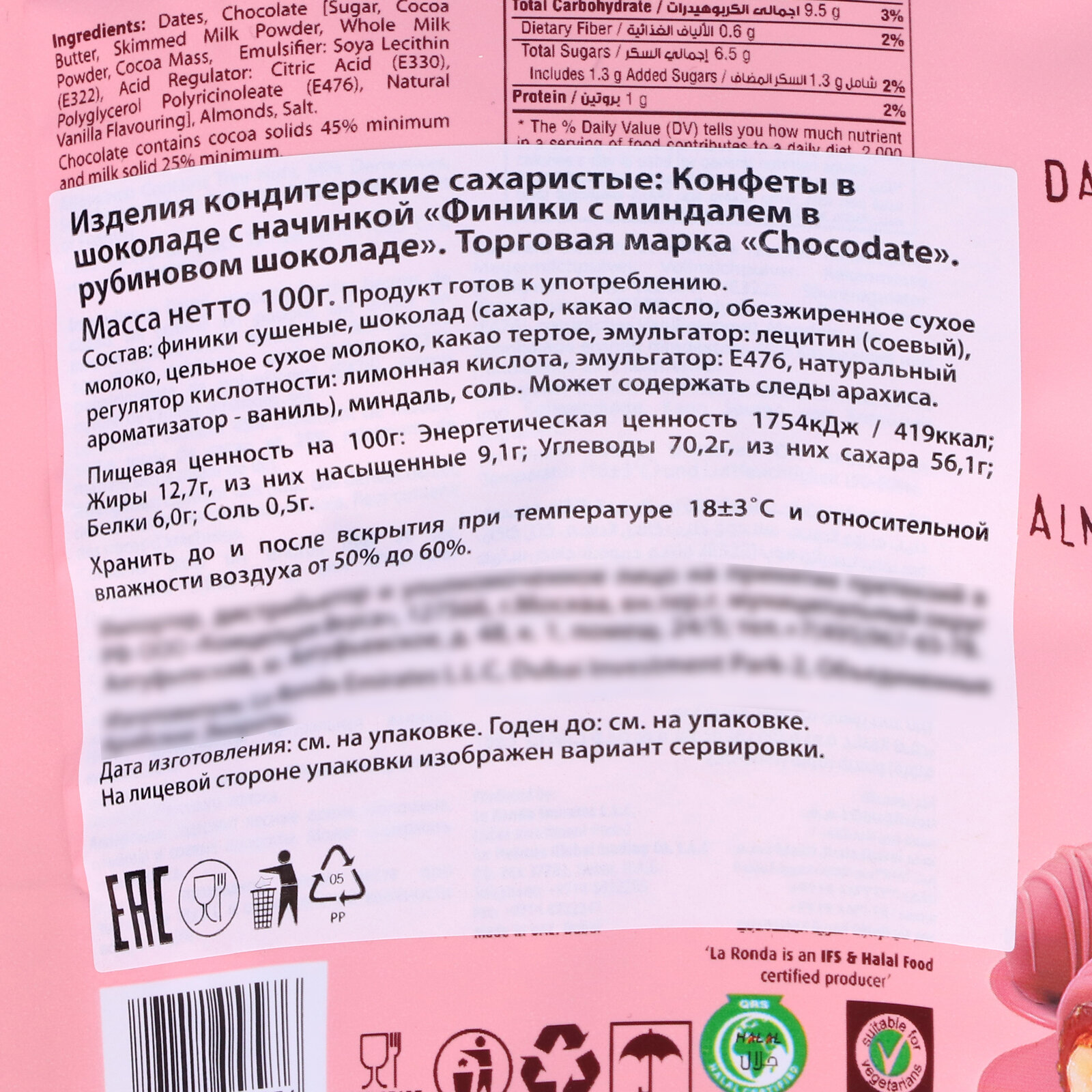 | Состав | финики сушеные, белый шоколад (сахар, какао масло, цельное сухое молоко, обезжиренное сухое молоко, молочный жир, эмульгатор: лецитин (соевый), Е476; натуральный ароматизатор - ваниль), карамель (цельное сухое молоко, обезжиренное сухое молоко, молочный жир, глюкоза, гидрогенизированное растительное масло, сахар, регулятор кислотности: гидрокарбонат натрия, лимонная кислота; соль, эмульгатор: лецитин (соевый), натуральный ароматизатор - ваниль), молочный шоколад (сахар, какао масло, цельное сухое молоко, какао тертое, обезжиренное сухое молоко, какао порошок, молочный жир, эмульгатор: лецитин (соевый), натуральный ароматизатор - ваниль, эмульгатор: Е476), миндаль, соль. Может содержать следы арахиса. |