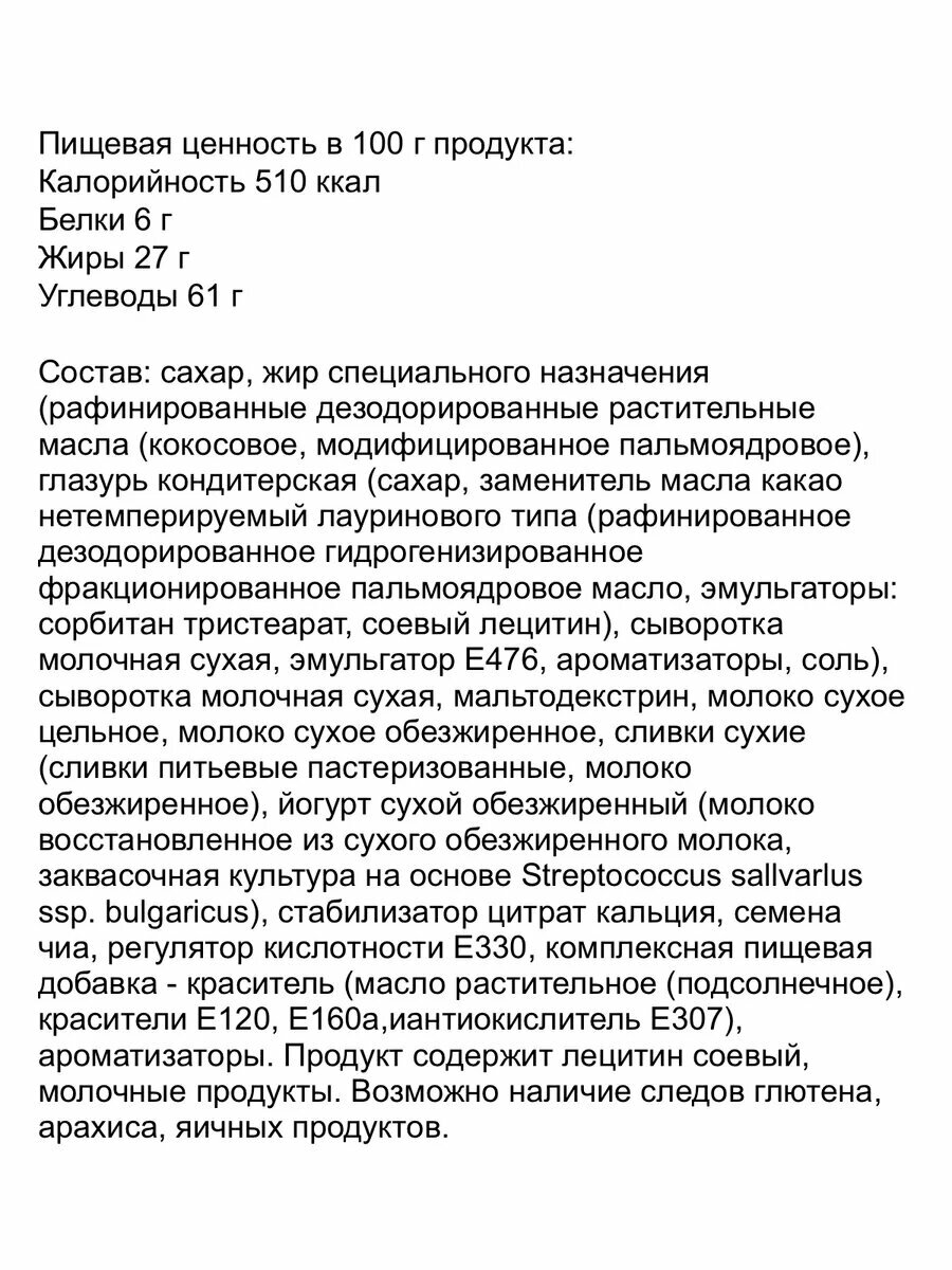 Состав | патока, сахар, агенты желирующие: каррагинан, пектин; загуститель Е1422, регуляторы кислотности: Е331(i), Е330, Е270; краситель (вода, краситель Е160с, эмульгатор Е433), глазирователь (масло растительное подсолнечное, глазирователь (Е901), антиокислители (Е320, Е321, Е310), регулятор кислотности (Е330), эмульгатор Е471), ароматизаторы. Возможно наличие следов молочных продуктов, продуктов яичных, лецитина соевого, глютена и продукты их переработки |