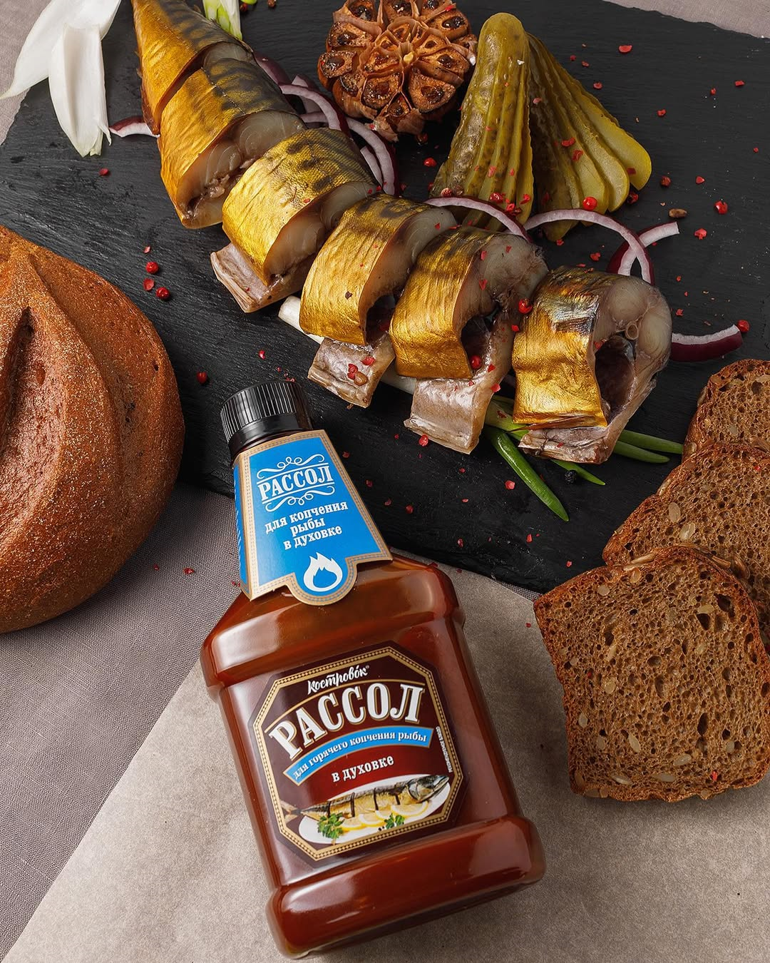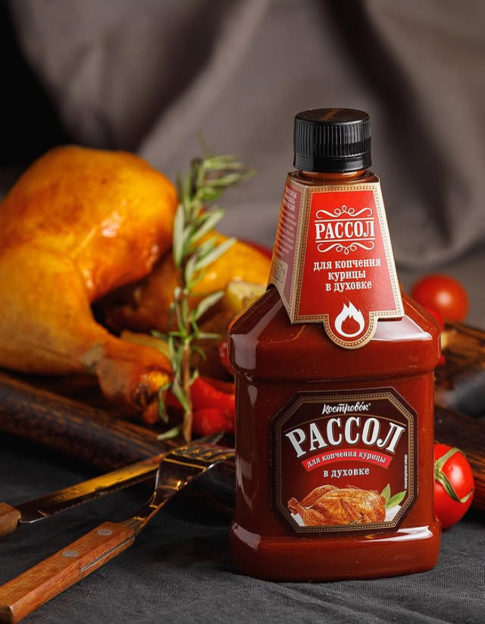 | Способ приготовления | для сала: несоленое сало или грудинку нарежьте брусочками по 3−4 см, обмажьте маринадом из расчета 1 бутылка на 3 кг сала и оставьте в холодильнике на 24 часа; переложите продукты на противень и готовьте в духовке в течение 30 минут при температуре 150 °C до готовности; готовый продукт хранить в холодильнике; для рыбы: свежую рыбу выпотрошите и разрежьте вдоль хребта на две части, обмажьте маринадом из расчёта одна бутылка на 3 кг рыбы и поставьте в холодильник на 1 час; выложите рыбу на решетку кожей вниз и поместите в духовку; рыбу готовьте 15 минут при 150 °C.; для курицы: куриные окорочка или крылья разрежьте пополам и замаринуйте в маринаде из расчета одна бутылка на 3 кг продукта; оставьте в холодильнике крылышки на 1 час, окорочка — на 3−4 часа; выложите продукты на противень или решетку и готовьте в духовке 30−40 минут при температуре 170 °C до готовности |