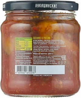 | Состав | баклажаны, томаты, перец сладкий, масло растительное, сахар-песок, чеснок, соль, перец красный молотый, специи |