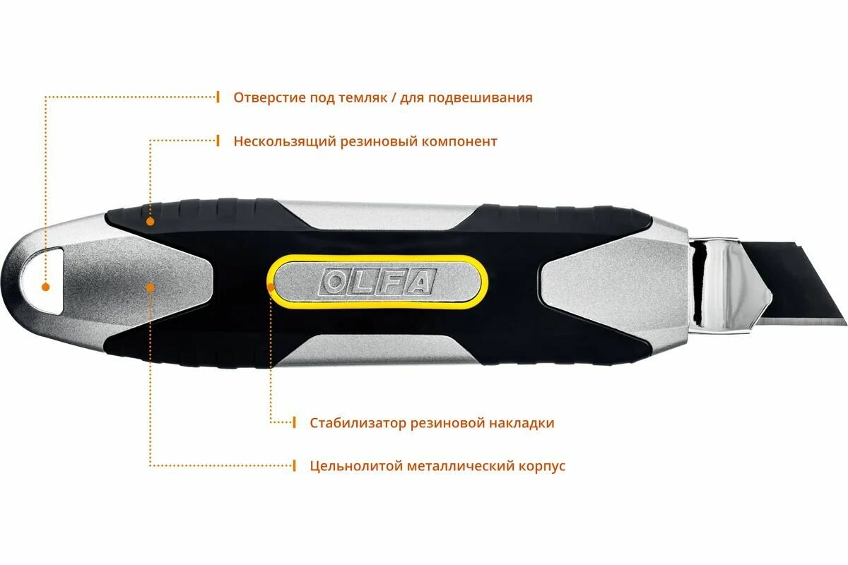 | Дополнительная информация | механизм "autolock" позволяет фиксировать положение лезвия автоматически; металлический выступ из стали толщиной 1.2 мм может использоваться для открывания банок с краской, заправки ковровых покрытий, вскрытия упаковки и т.д.; не подвержен воздействию органических растворителей; совместим с лезвиями шириной 18 мм (LFB, LB, LBB, LWB) |