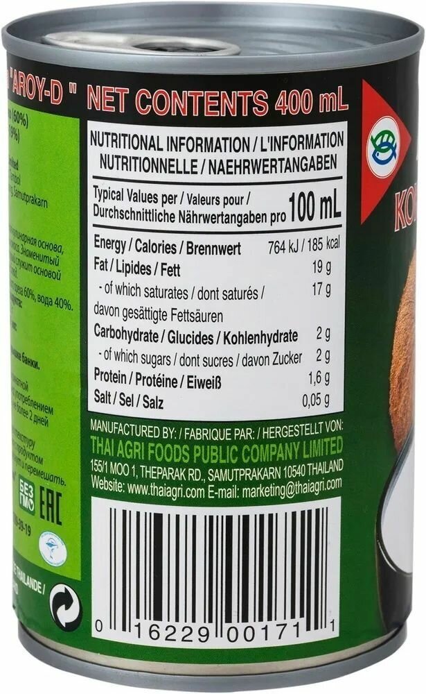 Молоко Aroy-D кокосовое 70%, жирность 17-19%, 400 мл информация: