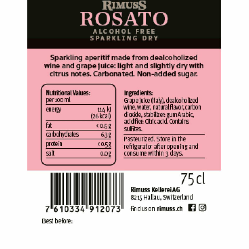 Шампанское безалкогольное Rimuss ROSATO розовое сухое, Швейцария, 750 мл информация: