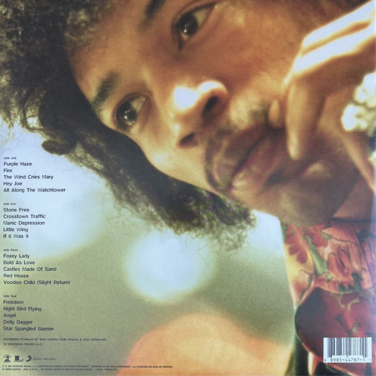 | Треклист | A1. Purple Haze 2:51 A2. Fire 2:43 A3. The Wind Cries Mary 3:20 A4. Hey Joe 3:29 A5. All Along The Watchtower 3:58 B1. Stone Free 3:35 B2. Crosstown Traffic 2:19 B3. Manic Depression 3:42 B4. Little Wing 2:25 B5. If 6 Was 9 5:34 C1. Foxey Lady 3:18 C2. Bold As Love 4:11 C3. Castles Made Of Sand 2:47 C4. Red House 3:50 C5. Voodoo Child (Slight Return) 5:12 D1. Freedom 3:25 D2. Night Bird Flying 3:50 D3. Angel 4:22 D4. Dolly Dagger 4:45 D5. Star Spangled Banner 3:46 |