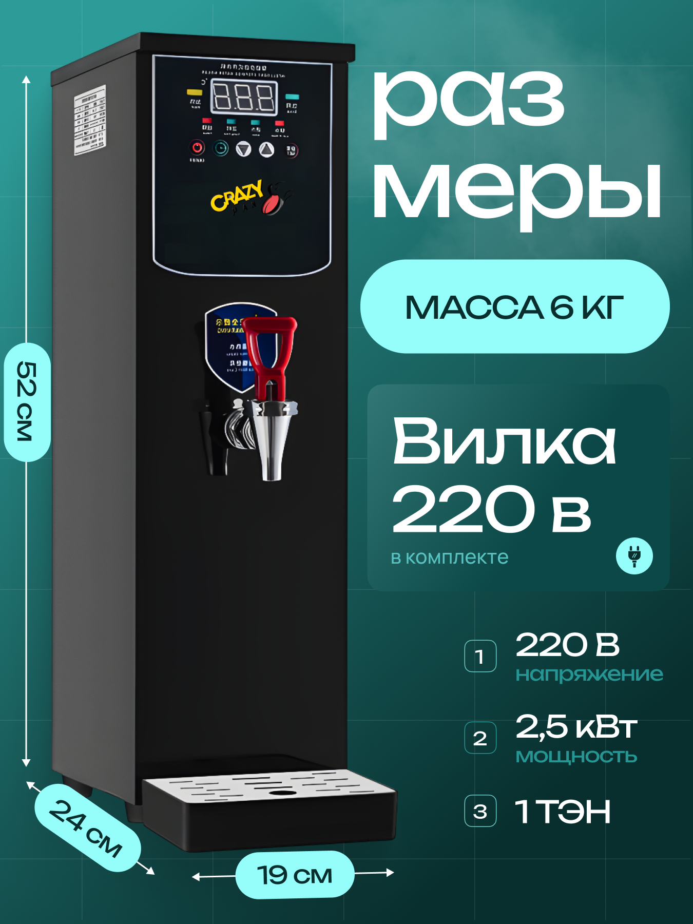 Электрокипятильник проточный Crazy Pan CP-IB22, 2,5 кВт, 22л/ч, таймер, объем бойлера 8 литров, черный информация: