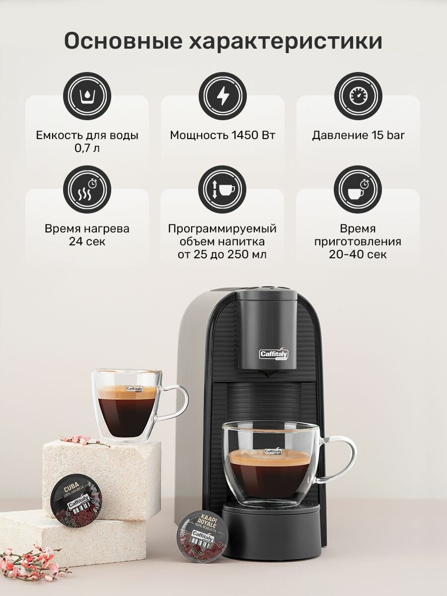 | Дополнительная информация | Совместимые капсулы следующих систем: Caffitaly; K-fee; Pauling,Рекомендованные производителем Оригинальные капсулы Caffitaly содержат больший объем кофе и имеют две мембраны для получения бархатистой пенки |