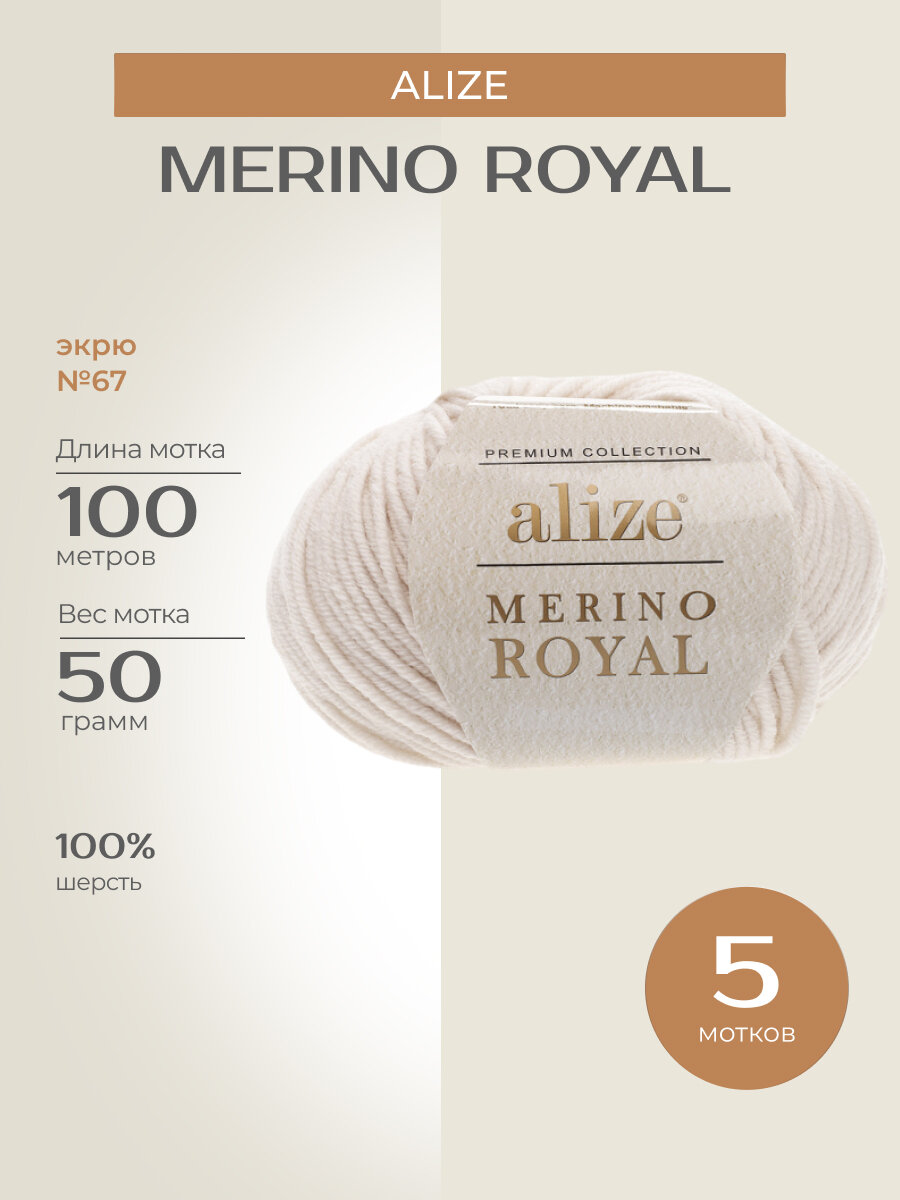 Пряжа для вязания крючком, спицами Alize Ализе Merino royal средняя, шерсть 100%, цвет 67 экрю, 5 шт. по 50 г, 100 м информация: