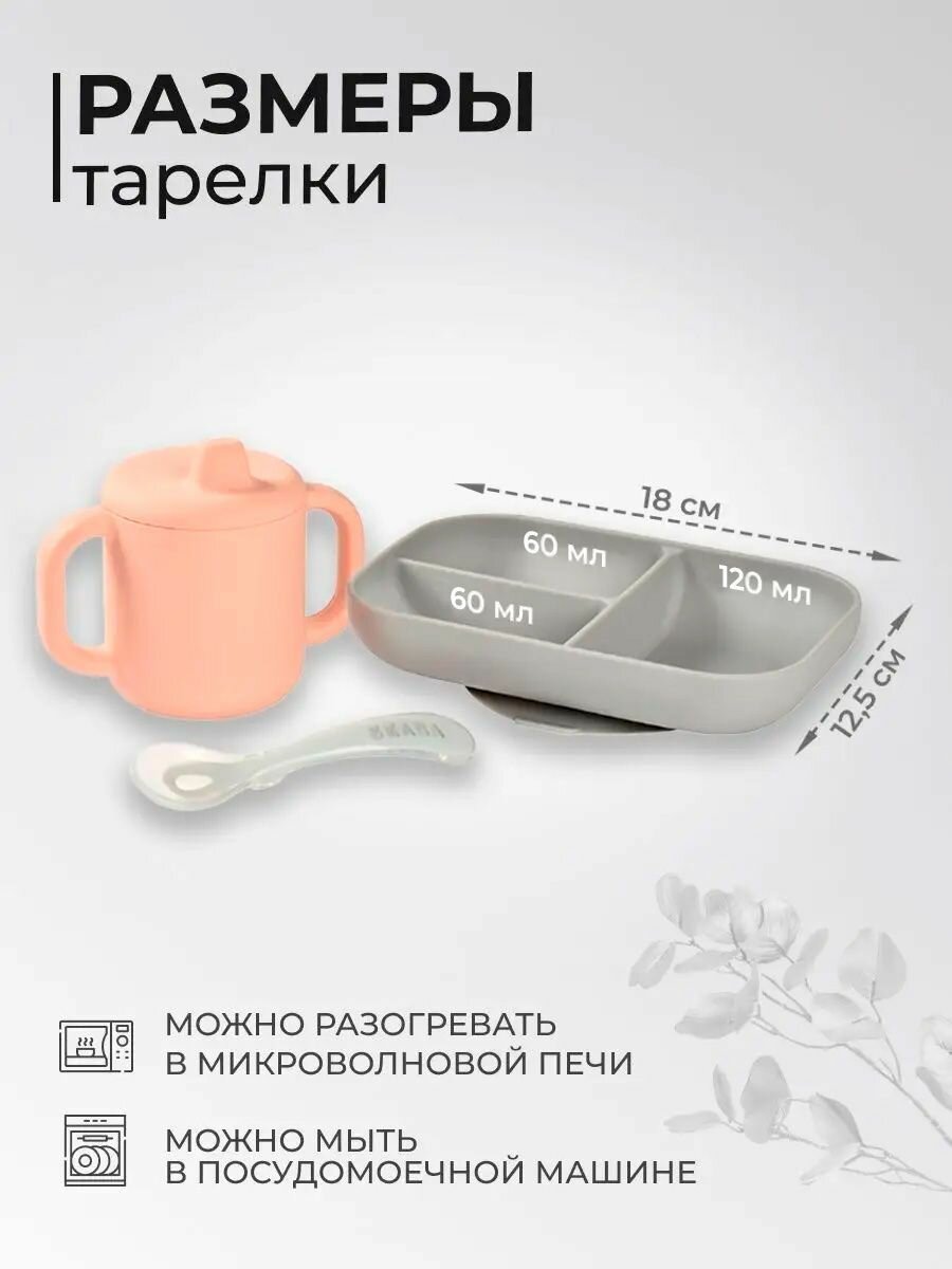 BEABA набор силиконовой детской посуды: секционная тарелка на присоске, силиконовая кружка с ручками, ложка детская для кормления и прикорма информация: