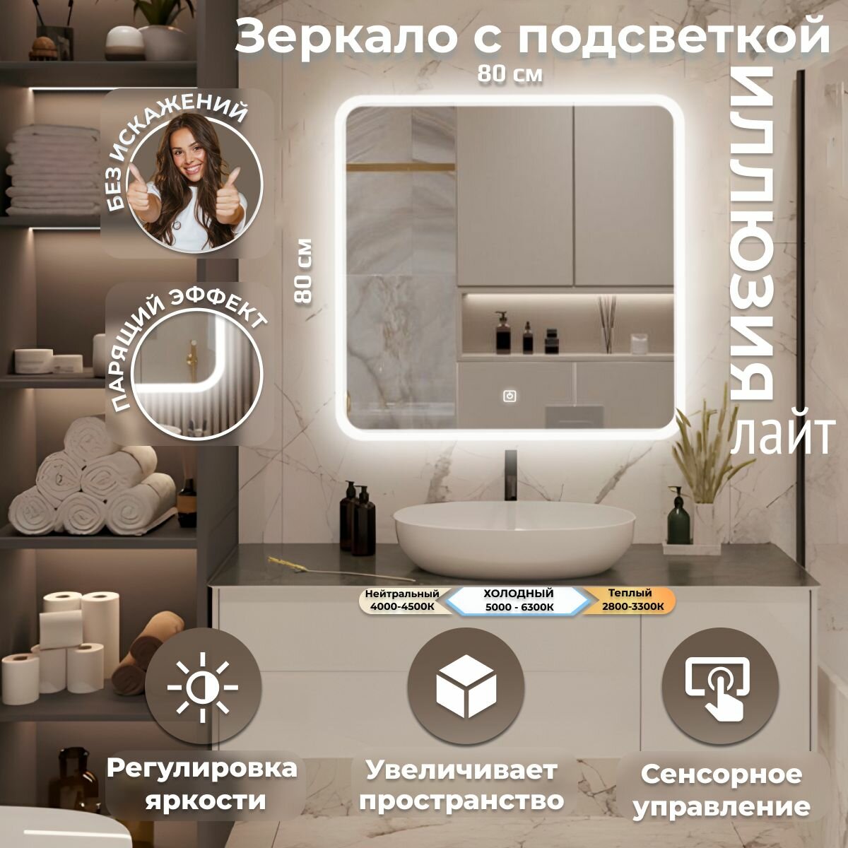 Зеркало настенное с подсветкой,фронтальной подсветкой,фоновой подсветкой и сенсорным выключателем для ванной, Иллюзия лайт 80х80 7 800 ₽