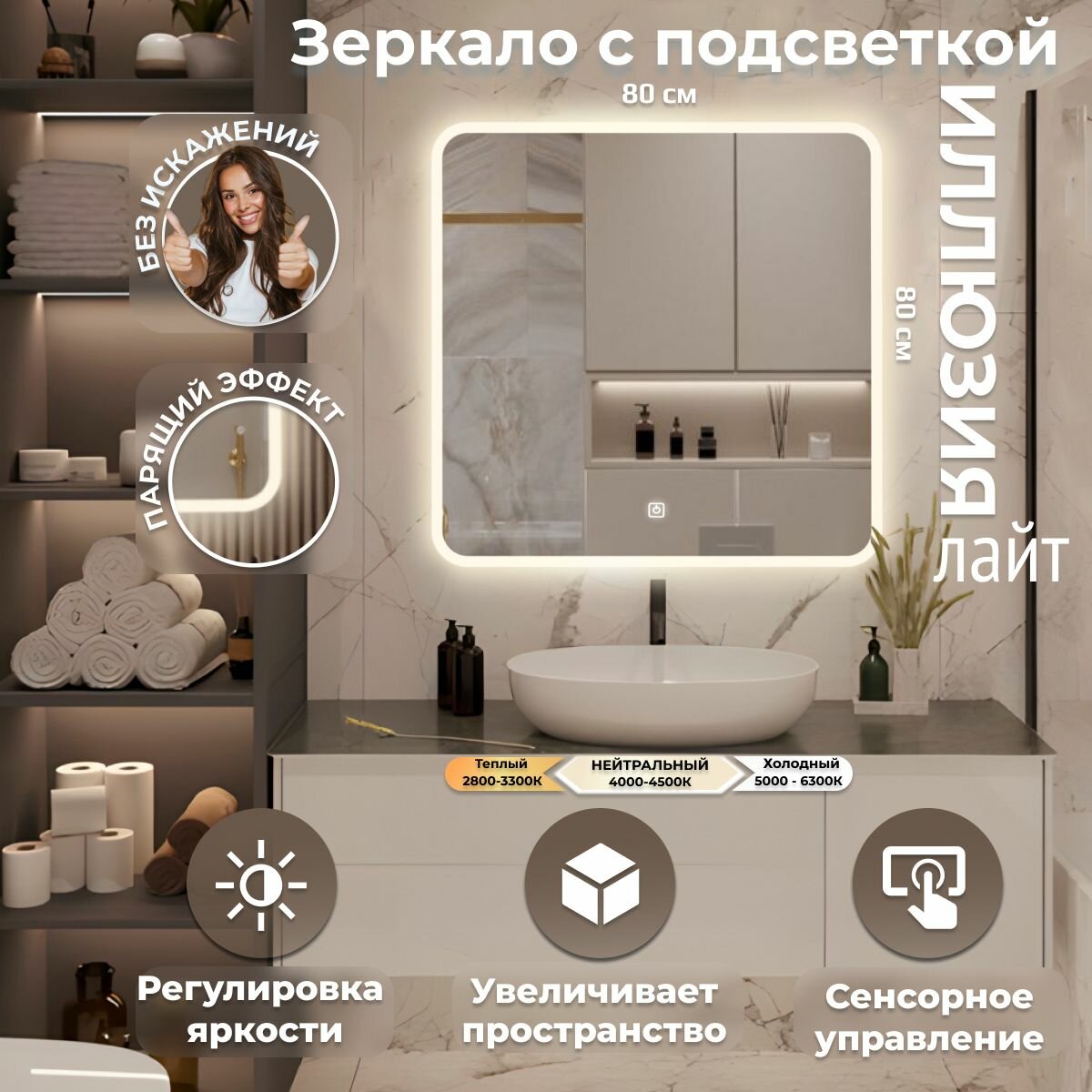 Отзывы на Зеркало настенное Иллюзия лайт, нейтральная подсветка, сенсорный выключатель, для ванной, 80х80