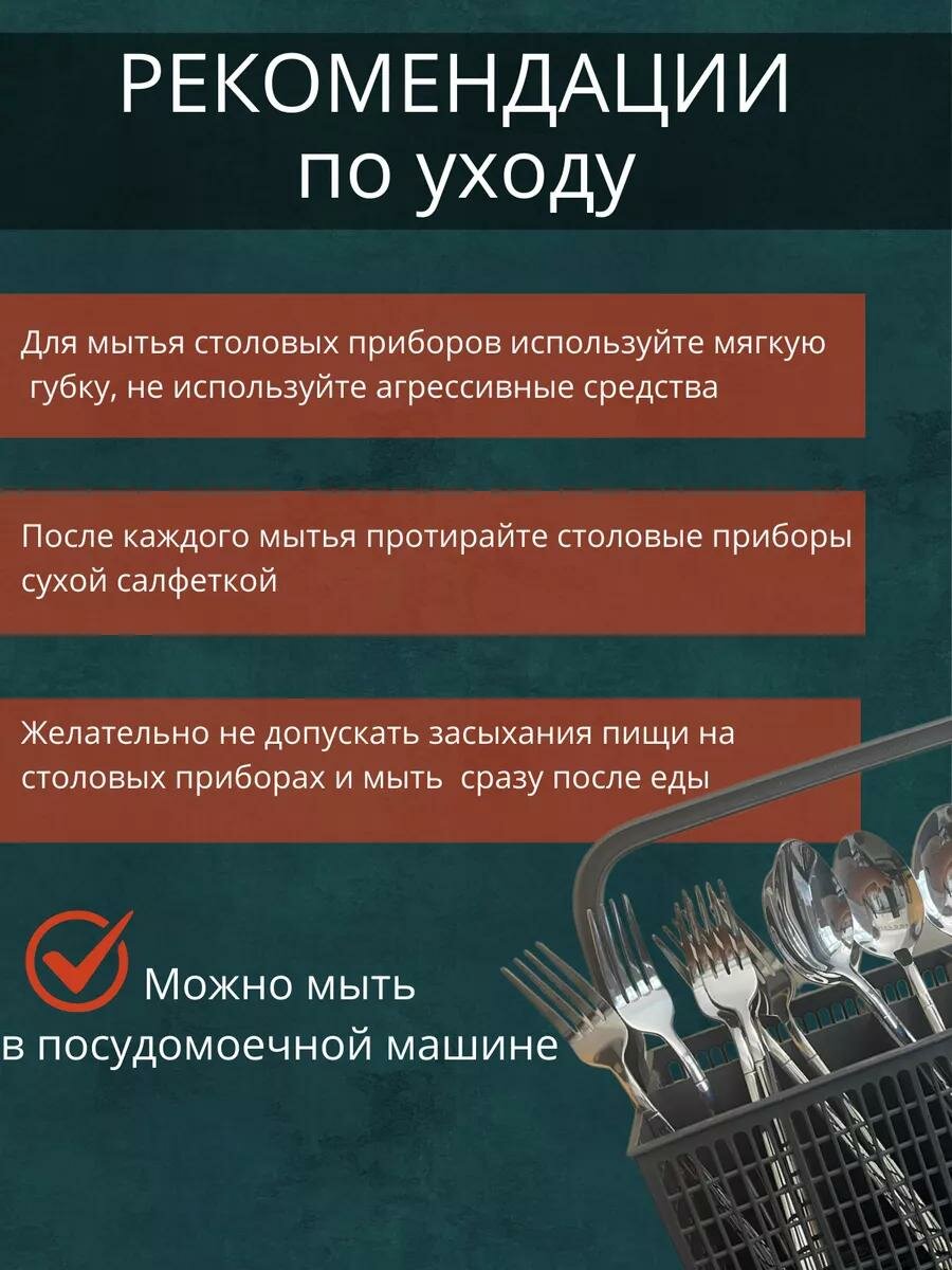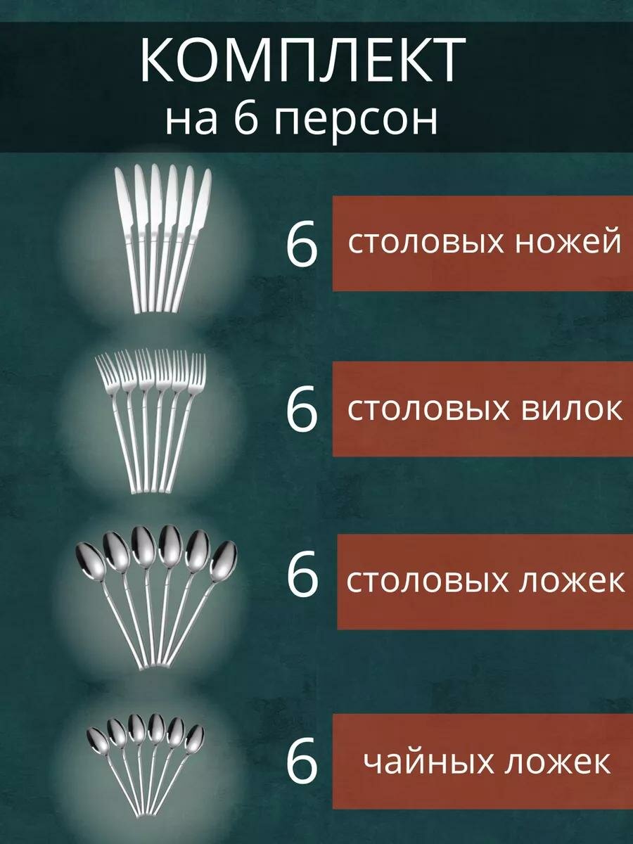 | В набор входит | 12 ложек, 6 вилок и 6 ножей, |