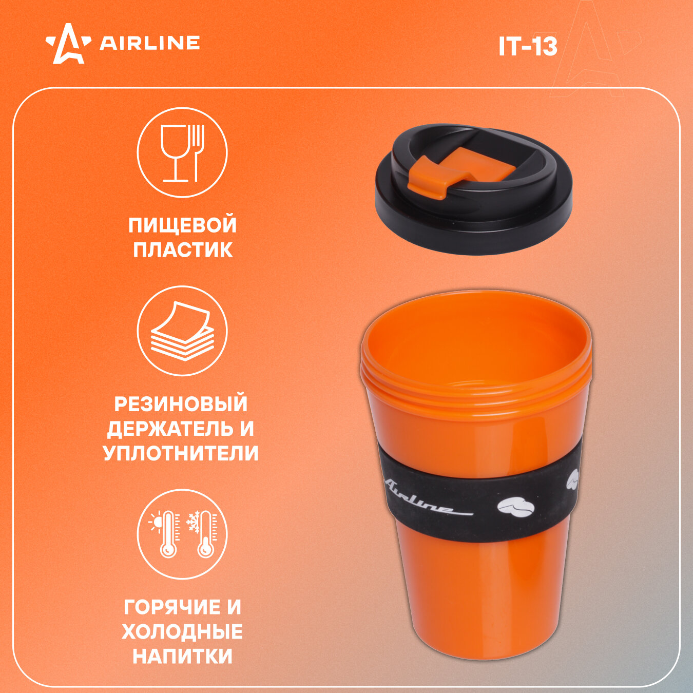 Кружка для кофе и др. напитков, герм. крышка, 350 мл, пластик, черн./оранж. IT-13 AIRLINE информация: