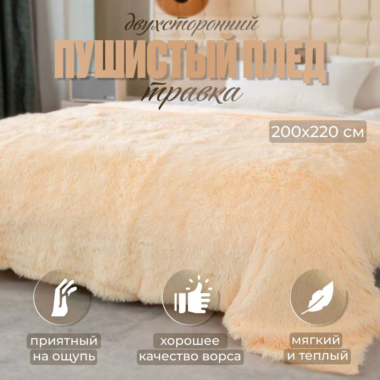 Плед Травка 200 x 220 см, двухсторонний пушистый с длинным ворсом, плед для дивана, плед на кровать, бежевый 2 000 ₽