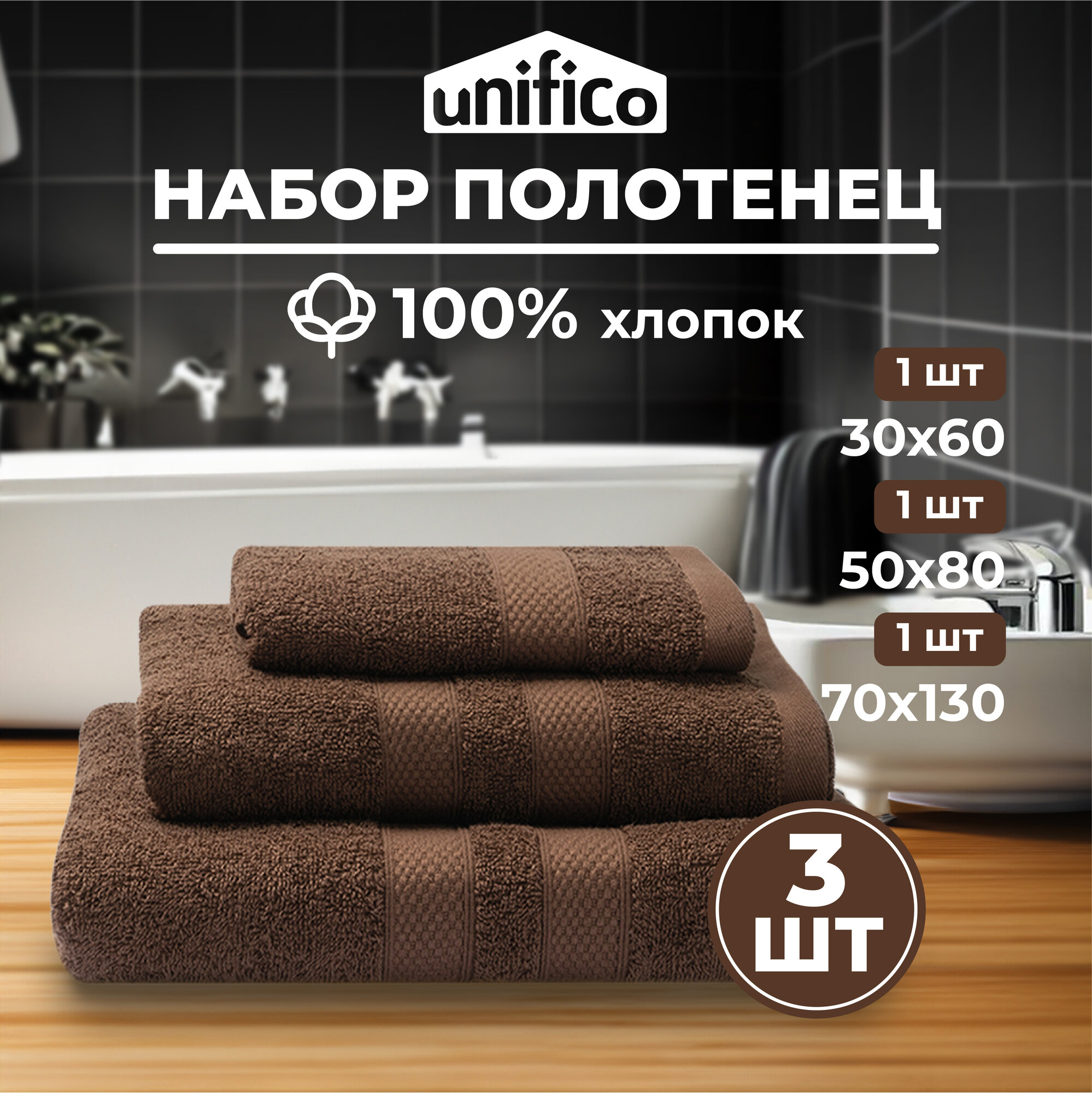 10 цен на Полотенца махровые Unifico Nature шоколад , набор из 3 шт:30х60-1, 50х80-1,70х130-1